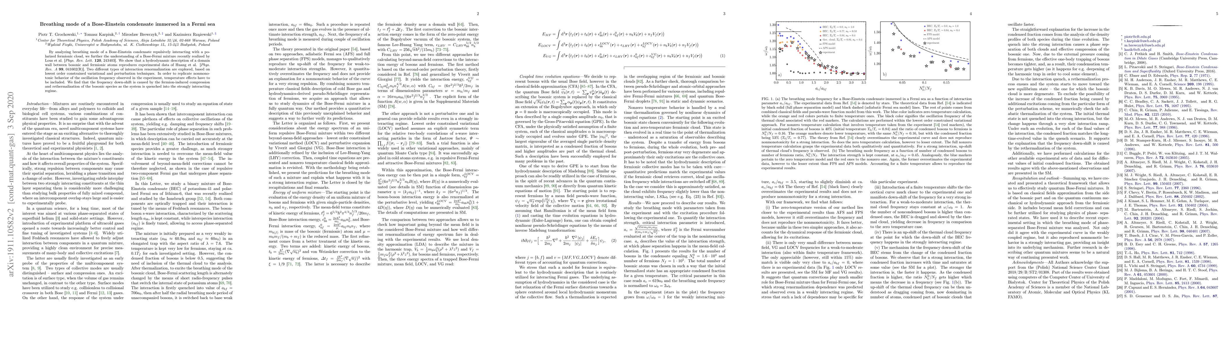 This paper investigates the breathing mode of a Bose-Einstein condensate interacting with a polarized Fermi sea, using hydrodynamic models to match experimental data. It explores two interaction renormalization techniques and finds that temperature effects and fermion-induced compression explain the observed nonmonotonic oscillation frequency shift.