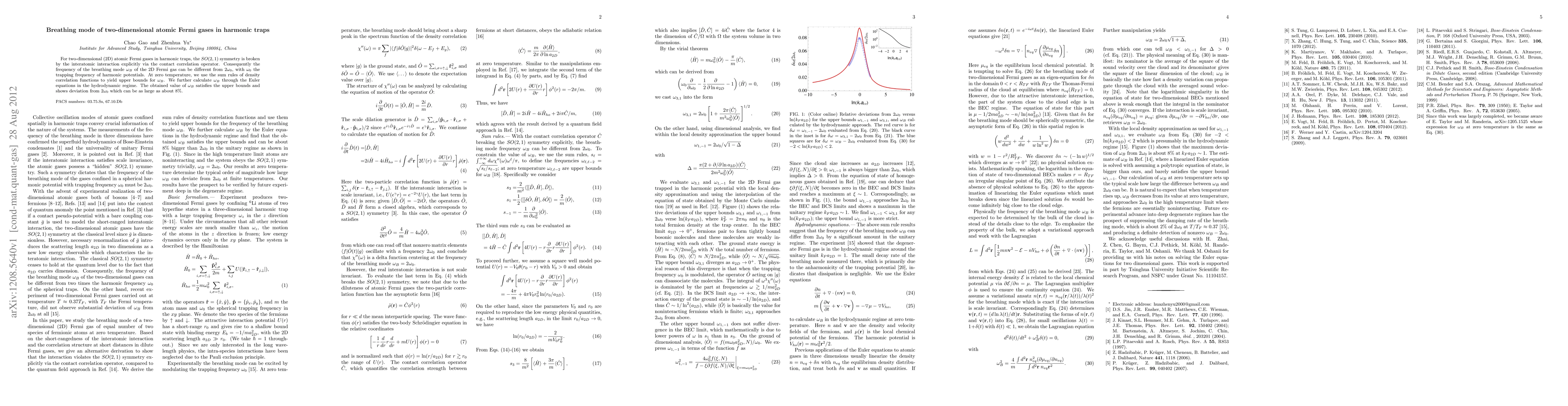 This paper investigates the breathing mode frequency $\omega_B$ of two-dimensional atomic Fermi gases in harmonic traps, showing that the interatomic interaction breaks SO(2,1) symmetry, leading to $\omega_B$ differing from $2\omega_0$. It calculates $\omega_B$ using sum rules and hydrodynamic equations, finding a deviation from $2\omega_0$ of up to 8%.