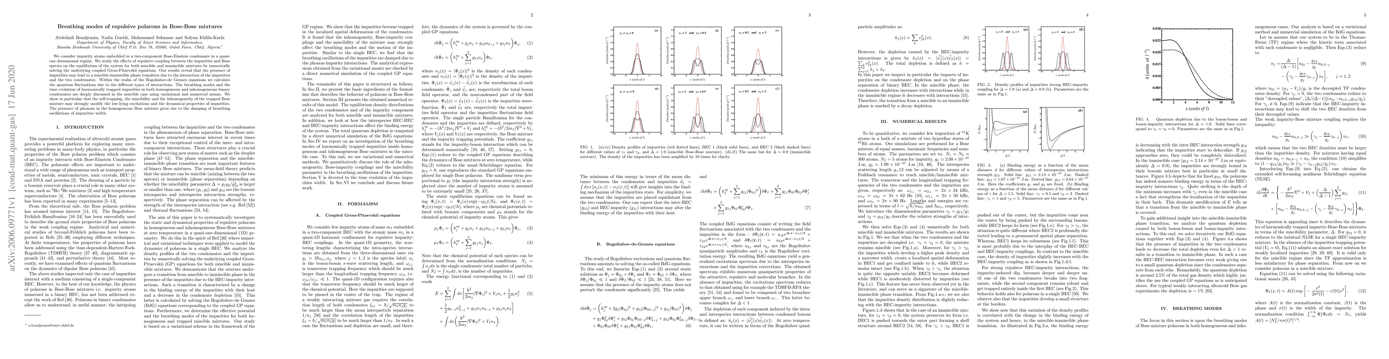 We consider impurity atoms embedded in a two-component Bose-Einstein condensate in a quasi-one dimensional regime. We study the effects of repulsive coupling between the impurities and Bose species on the equilibrium of the system for both miscible and immiscible mixtures by numerically solving the underlying coupled Gross-Pitaevskii equations. Our results reveal that the presence of impurities may lead to a miscible-immiscible phase transition due to the interaction of the impurities and the two condensates. Within the realm of the Bogoliubov-de Gennes equations we calculate the quantum fluctuations due to the different types of interactions. The breathing modes and the time evolution of harmonically trapped impurities in both homogeneous and inhomogeneous binary condensates are deeply discussed in the miscible case using variational and numerical means. We show in particular that the self-trapping, the miscibility and the inhomogeneity of the trapped Bose mixture may strongly modify the low-lying excitations and the dynamical properties of impurities. The presence of phonons in the homogeneous Bose mixture gives rise to the damping of breathing oscillations of impurities width.
