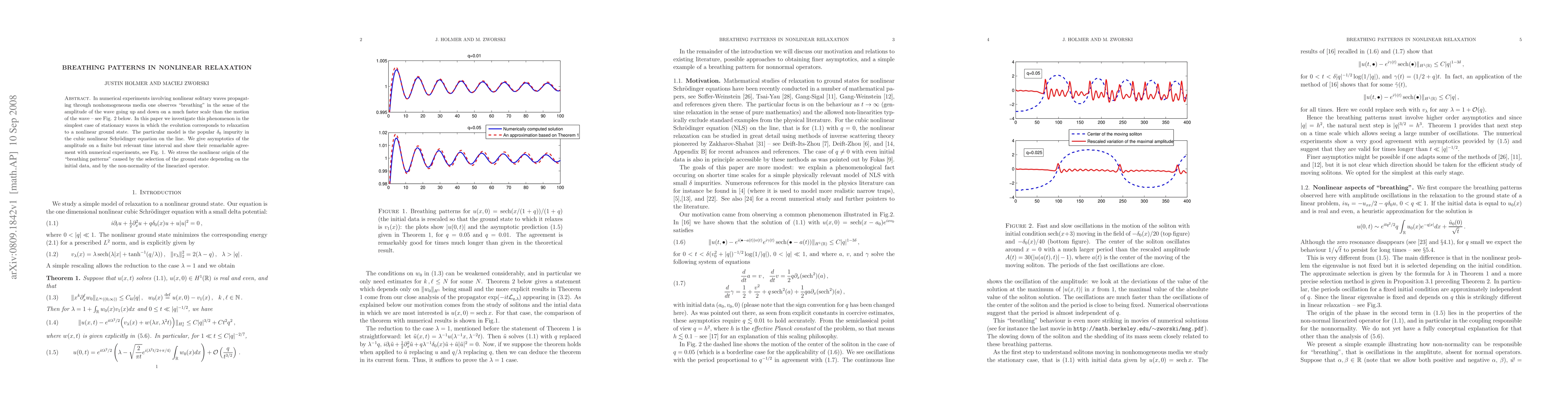 In numerical experiments involving nonlinear solitary waves propagating through nonhomogeneous media one observes "breathing" in the sense of the amplitude of the wave going up and down on a much faster scale than the motion of the wave. In this paper we investigate this phenomenon in the simplest case of stationary waves in which the evolution corresponds to relaxation to a nonlinear ground state. The particular model is the popular $ \delta_0 $ impurity in the cubic nonlinear Schroedinger equation on the line. We give asymptotics of the amplitude on a finite but relevant time interval and show their remarkable agreement with numerical experiments. We stress the nonlinear origin of the "breathing patterns" caused by the selection of the ground state depending on the initial data, and by the non-normality of the linearized operator.