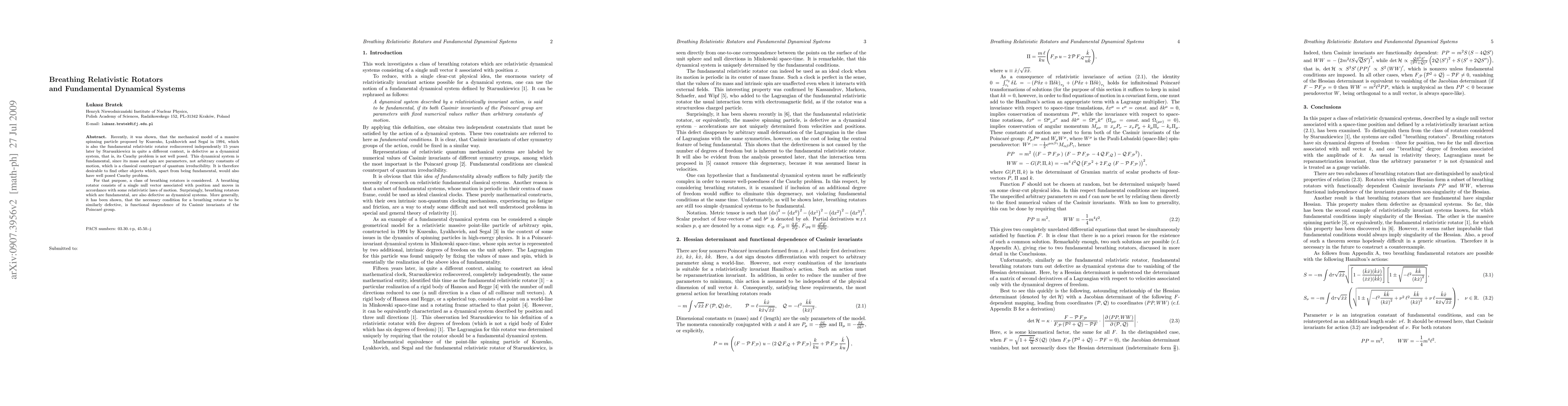 Recently, it was shown, that the mechanical model of a massive spinning particle proposed by Kuzenko, Lyakhovich and Segal in 1994, which is also the fundamental relativistic rotator rediscovered independently 15 years later by Staruszkiewicz in quite a different context, is defective as a dynamical system, that is, its Cauchy problem is not well posed. This dynamical system is fundamental, since its mass and spin are parameters, not arbitrary constants of motion, which is a classical counterpart of quantum irreducibility. It is therefore desirable to find other objects which, apart from being fundamental, would also have well posed Cauchy problem. For that purpose, a class of breathing rotators is considered. A breathing rotator consists of a single null vector associated with position and moves in accordance with some relativistic laws of motion. Surprisingly, breathing rotators which are fundamental, are also defective as dynamical systems. More generally, it has been shown, that the necessary condition for a breathing rotator to be similarly defective, is functional dependence of its Casimir invariants of the Poincar{\'e} group.