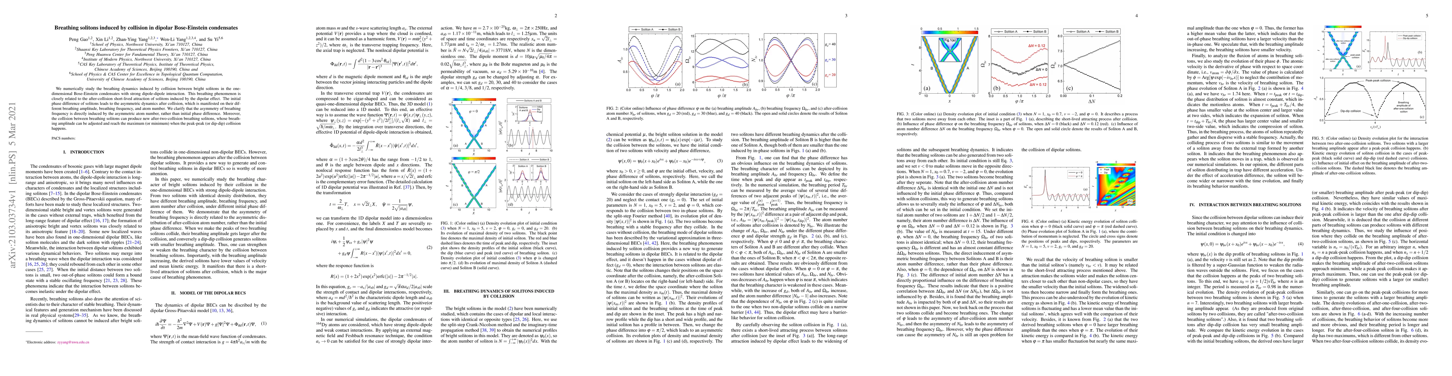 This research numerically investigates the breathing dynamics of solitons in dipolar Bose-Einstein condensates following their collision, revealing that the dipolar effect induces short-lived attraction and asymmetric breathing phenomena due to initial phase differences. The study finds that the asymmetry in breathing frequency arises from the asymmetric atom number rather than phase differences, and it further demonstrates the formation of new breathing solitons post-collision.