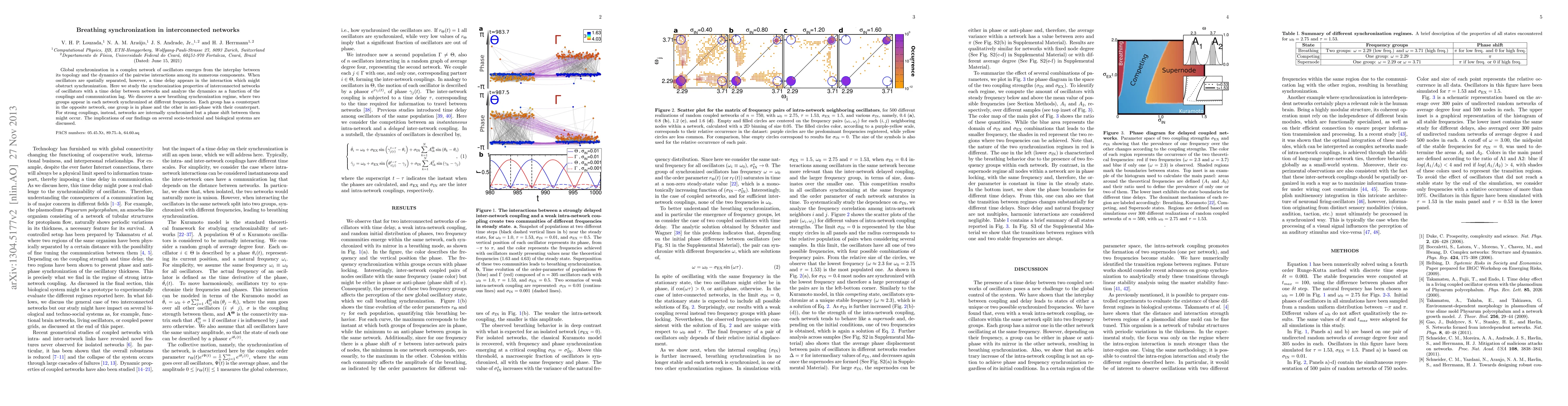 Researchers discovered a new breathing synchronization regime in interconnected networks of oscillators with time delays, where two groups synchronize at different frequencies across opposing networks. Strong couplings lead to internal network synchronization but may result in phase shifts between networks.