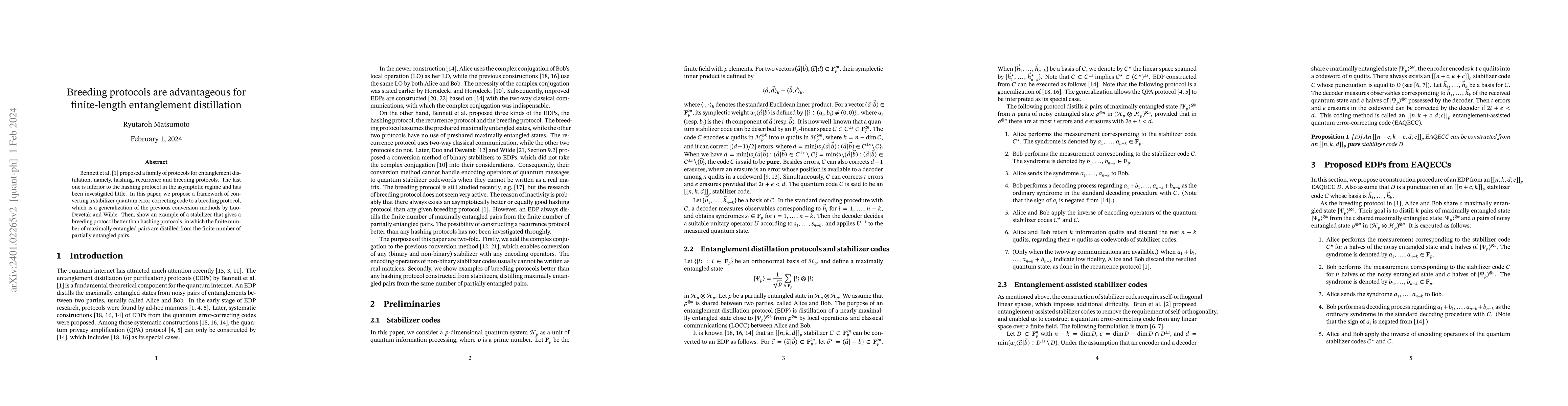 This paper proposes a framework to convert stabilizer quantum error-correcting codes into breeding protocols for entanglement distillation, demonstrating that in certain finite-length scenarios, breeding protocols outperform hashing protocols. This generalizes previous conversion methods and highlights the potential advantages of breeding protocols in practical applications.