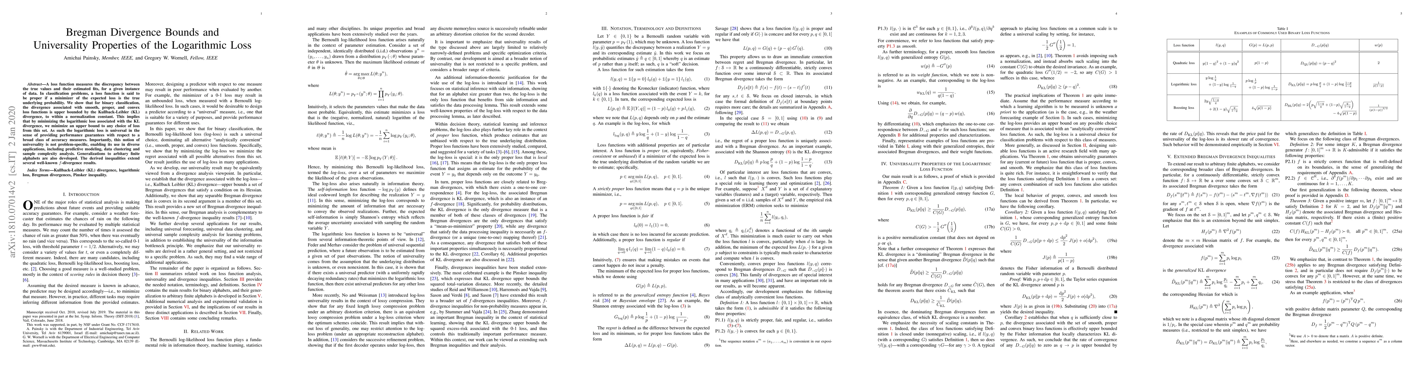 A loss function measures the discrepancy between the true values and their estimated fits, for a given instance of data. In classification problems, a loss function is said to be proper if a minimizer of the expected loss is the true underlying probability. We show that for binary classification, the divergence associated with smooth, proper, and convex loss functions is upper bounded by the Kullback-Leibler (KL) divergence, to within a normalization constant. This implies that by minimizing the logarithmic loss associated with the KL divergence, we minimize an upper bound to any choice of loss from this set. As such the logarithmic loss is universal in the sense of providing performance guarantees with respect to a broad class of accuracy measures. Importantly, this notion of universality is not problem-specific, enabling its use in diverse applications, including predictive modeling, data clustering and sample complexity analysis. Generalizations to arbitrary finite alphabets are also developed. The derived inequalities extend several well-known $f$-divergence results.