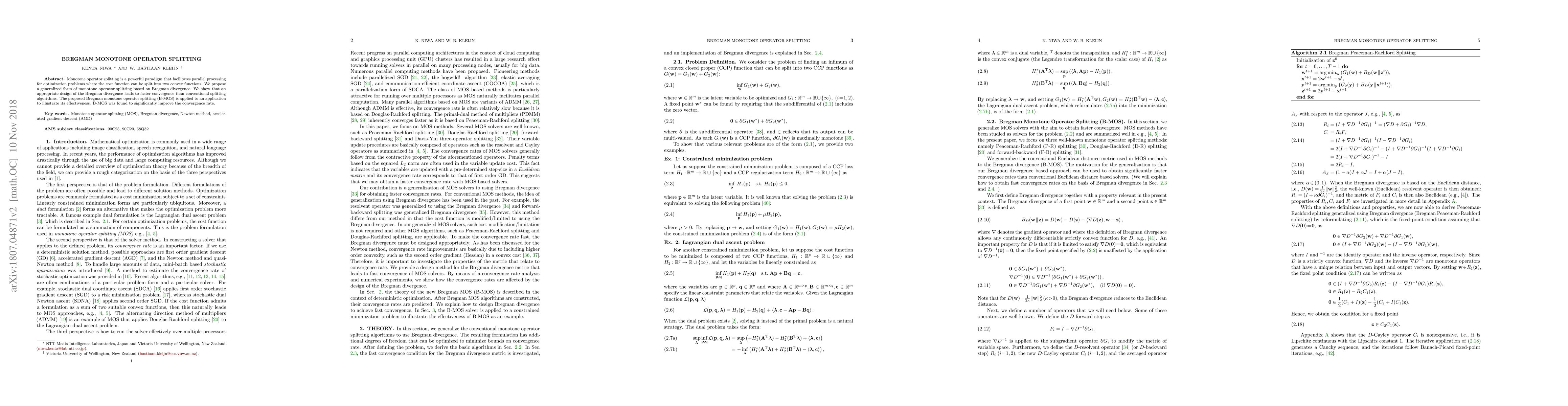 This paper proposes a generalized Bregman monotone operator splitting (B-MOS) method for parallel optimization, demonstrating faster convergence compared to conventional splitting algorithms through the use of Bregman divergence. The effectiveness of B-MOS is illustrated through an application, showing significant improvements in convergence rate.