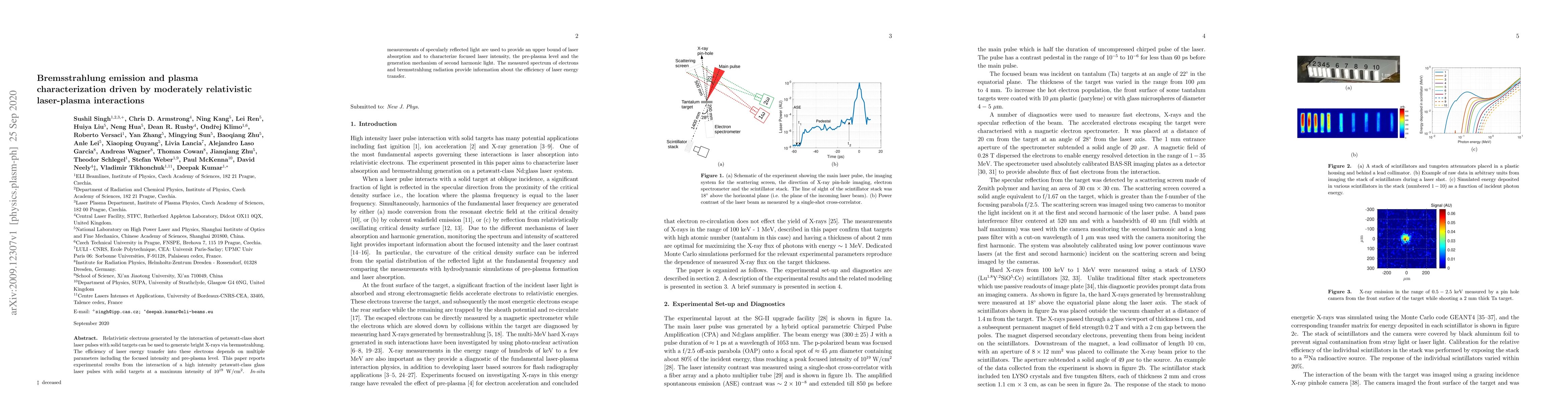 This paper investigates the generation of relativistic electrons and bright X-rays via bremsstrahlung from petawatt-class laser-plasma interactions, focusing on the efficiency of energy transfer influenced by laser intensity and pre-plasma levels. Experimental results reveal the mechanisms behind laser absorption and second harmonic generation, alongside the characterization of plasma conditions.