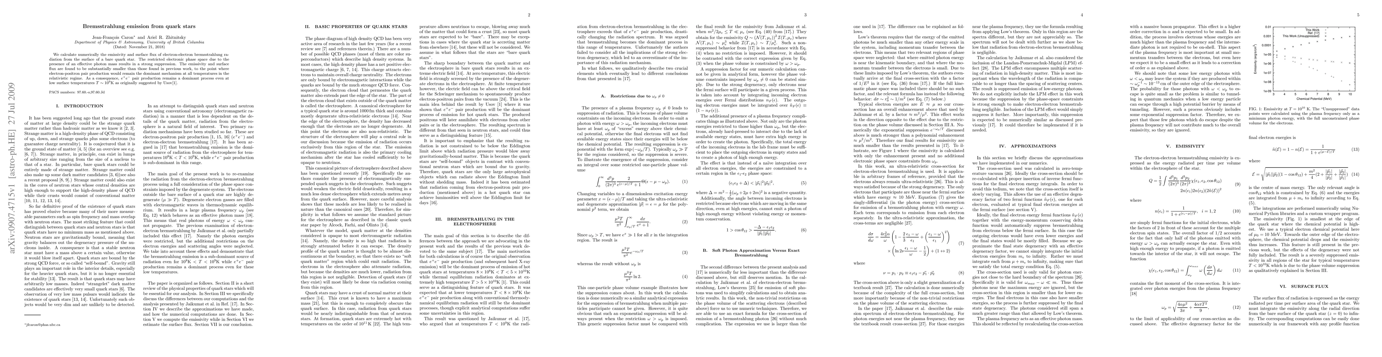 We calculate numerically the emissivity and surface flux of electron-electron bremsstrahlung radiation from the surface of a bare quark star. The restricted electronic phase space due to the presence of an effective photon mass results in a strong suppression. The emissivity and surface flux are found to be substantially smaller than those found in previous work, to the point where electron-positron pair production would remain the dominant mechanism at all temperatures in the relativistic regime. As a consequence, pair production remains a dominant process even at low surface temperatures as originally suggested by Usov in arXiv:astro-ph/9712304.