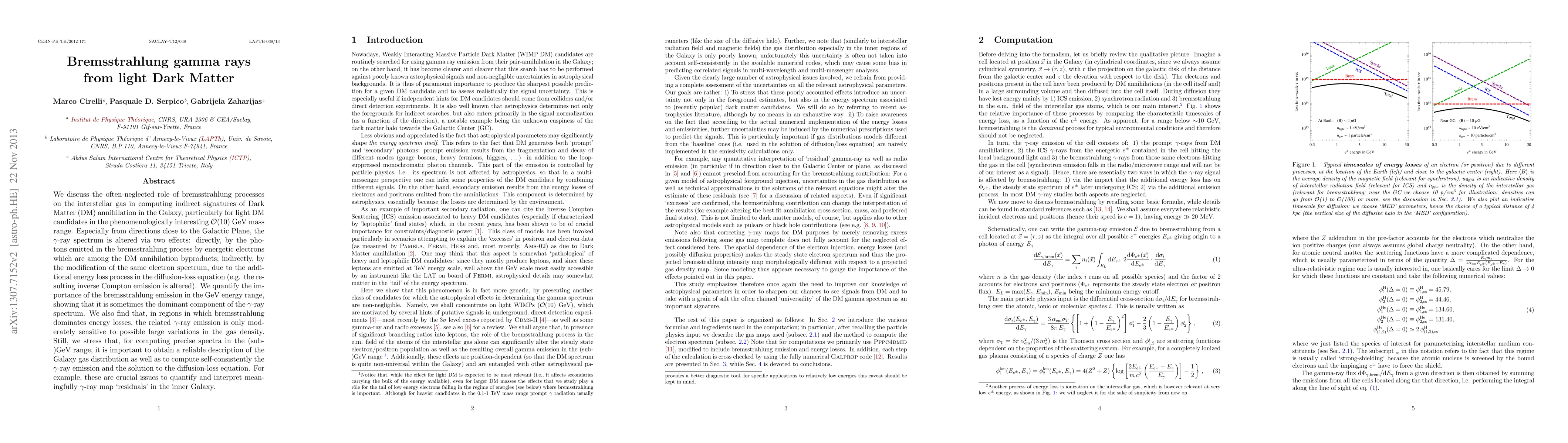 We discuss the often-neglected role of bremsstrahlung processes on the interstellar gas in computing indirect signatures of Dark Matter (DM) annihilation in the Galaxy, particularly for light DM candidates in the phenomenologically interesting O(10) GeV mass range. Especially from directions close to the Galactic Plane, the expected gamma-ray spectrum is altered via two effects: directly, by the photons emitted in the bremsstrahlung process on the interstellar gas by energetic electrons which are among the DM annihilation byproducts; indirectly, by the modification of the same electron spectrum, due to the additional energy loss process in the diffusion-loss equation (e.g. the resulting inverse Compton emission is altered). We quantify the importance of the bremsstrahlung emission in the GeV energy range, showing that it is the dominant component of the gamma-ray spectrum for some cases. We also find that, in regions in which bremsstrahlung dominates energy losses, the related gamma-ray emission is only moderately sensitive to possible large variations in the gas density. Still, we stress that, for computing precise spectra in the (sub-)GeV range, it is important to obtain a reliable description of the inner Galaxy gas distribution as well as to compute self-consistently the gamma emission and the solution to the diffusion-loss equation. For example, these are crucial issues to quantify and interpret meaningfully gamma-ray map `residuals' in terms of (light) DM annihilations.