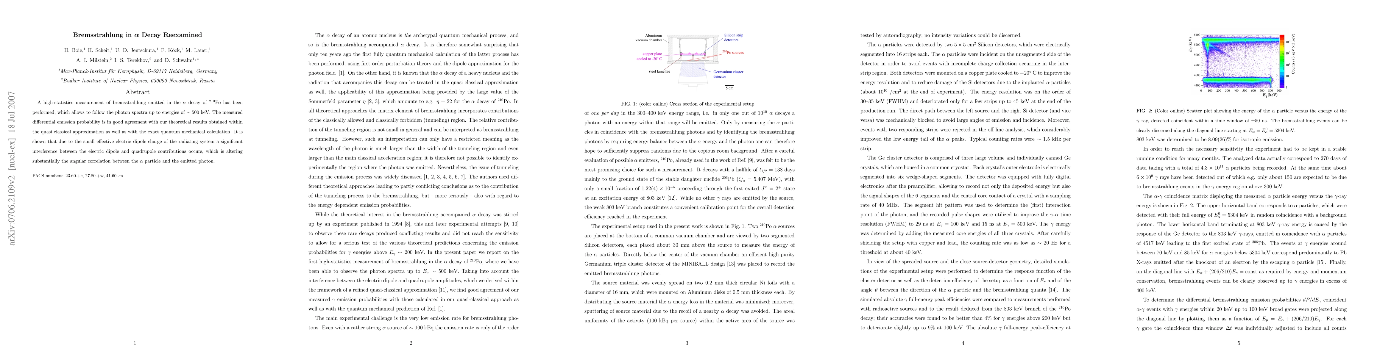Summary: High-statistics measurements of bremsstrahlung in 210Po alpha decay reveal photon spectra up to 500 keV, with results aligning with both quasi-classical and quantum mechanical theories. The study highlights significant interference between electric dipole and quadrupole contributions, significantly affecting the angular correlation between alpha particles and emitted photons.