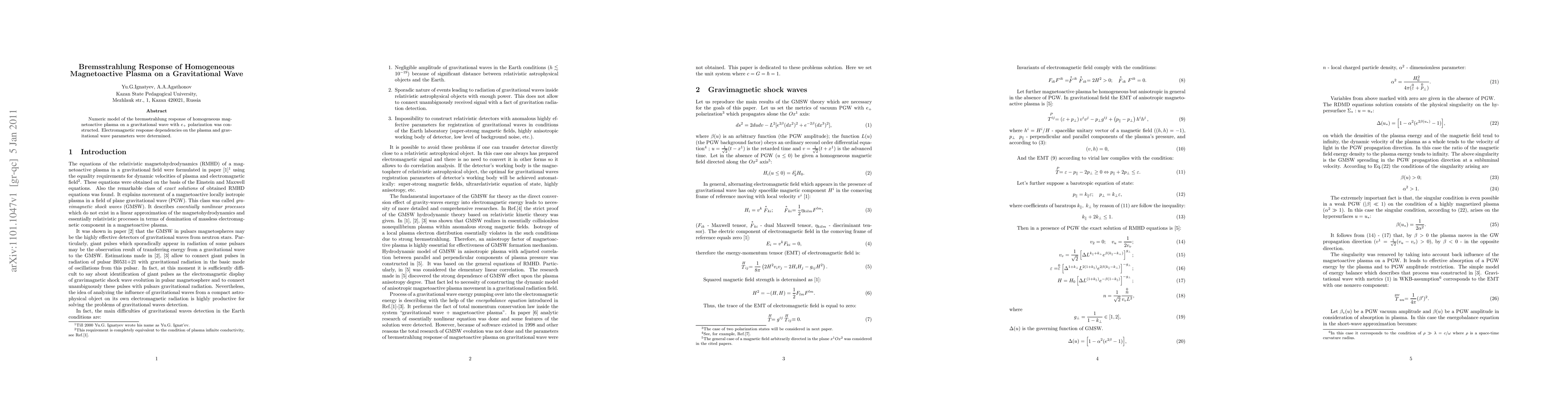 Summary: This paper constructs a numeric model to study the bremsstrahlung response of homogeneous magnetoactive plasma to a gravitational wave with $e_+$ polarization, determining how electromagnetic responses vary with plasma and gravitational wave parameters.