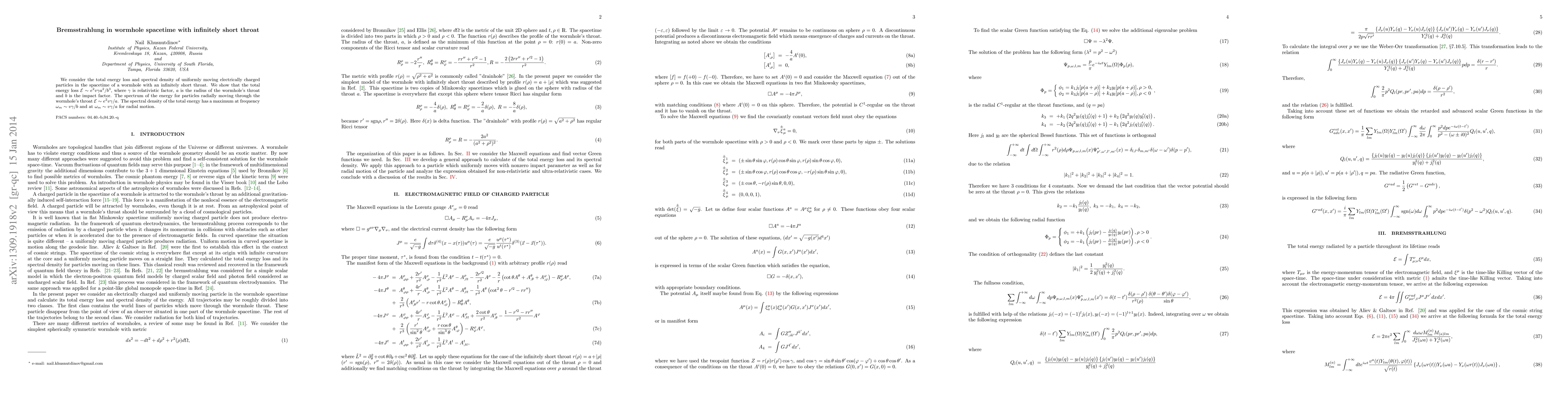 This paper investigates the bremstrahlung energy loss of charged particles in a wormhole with an infinitely short throat, revealing a total energy loss proportional to $e^2v\gamma a^2/b^3$ and a spectral density peak at frequencies $\omega_m \sim v\gamma/b$ and $\omega_m \sim v\gamma/a$.