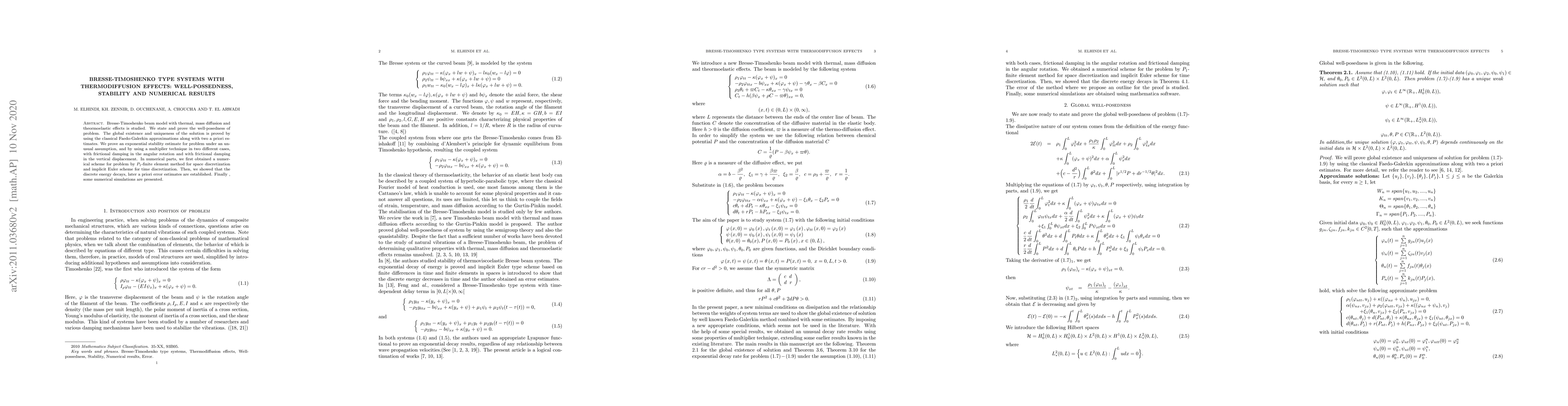 Researchers studied a mathematical model of a Bresse-Timoshenko beam with added thermal, mass diffusion, and thermoelastic effects, proving its well-posedness, stability, and numerical solutions.