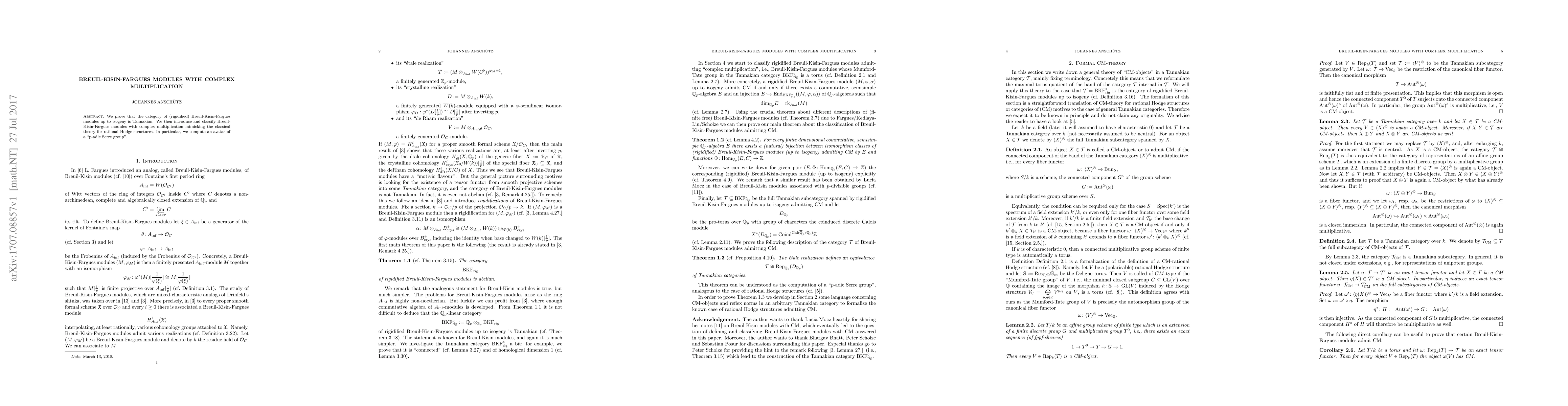 We prove that the category of (rigidified) Breuil-Kisin-Fargues modules up to isogeny is Tannakian. We then introduce and classify Breuil-Kisin-Fargues modules with complex multiplication mimicking the classical theory for rational Hodge structures. In particular, we compute an avatar of a "p-adic Serre group".