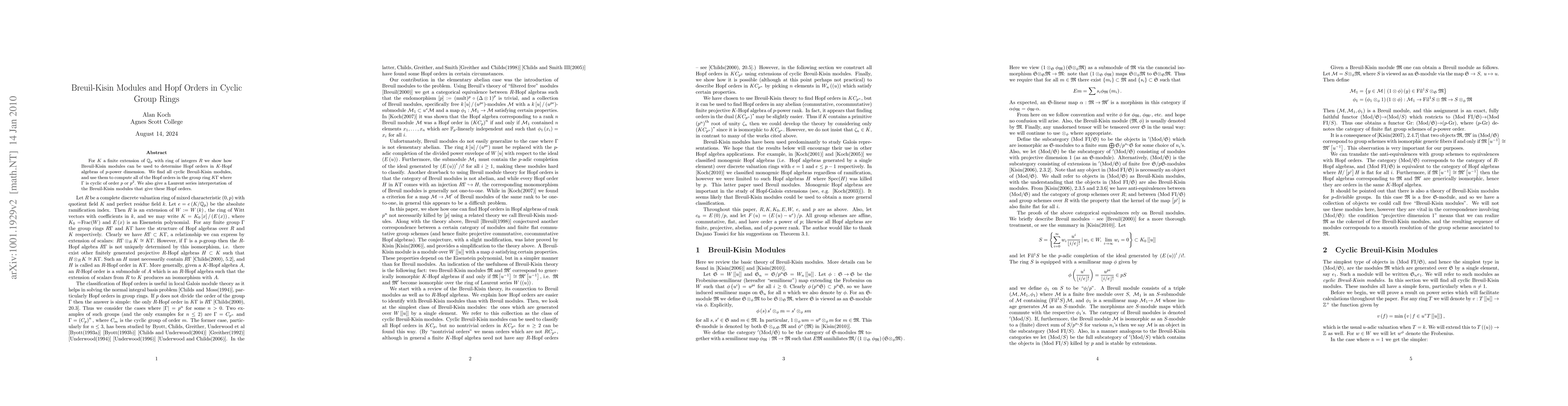 This paper explores the use of Breuil-Kisin modules to determine Hopf orders in $K$-Hopf algebras of $p$-power dimension, finding all cyclic Breuil-Kisin modules and computing Hopf orders in the cyclic group ring $K\Gamma$ for $\Gamma$ of order $p$ or $p^2$. It also provides a Laurent series interpretation for these modules.