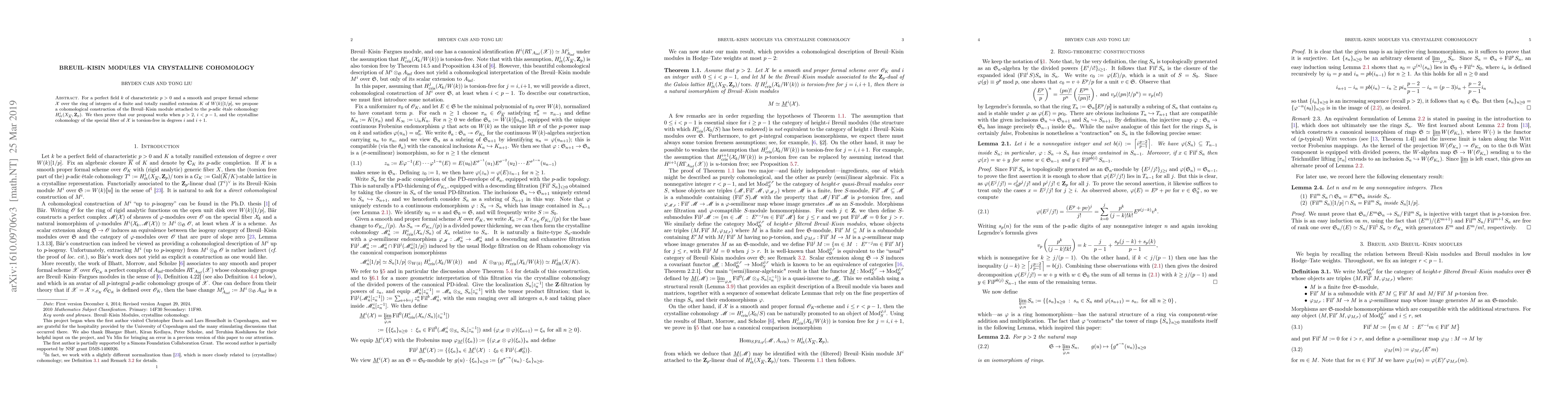 This research paper introduces a cohomological method to construct Breuil-Kisin modules using crystalline cohomology for specific conditions on a perfect field k of characteristic p>0 and a formal scheme X. The approach is validated for p>2, i<p-1, and torsion-free crystalline cohomology in degrees i and i+1 of X's special fiber.