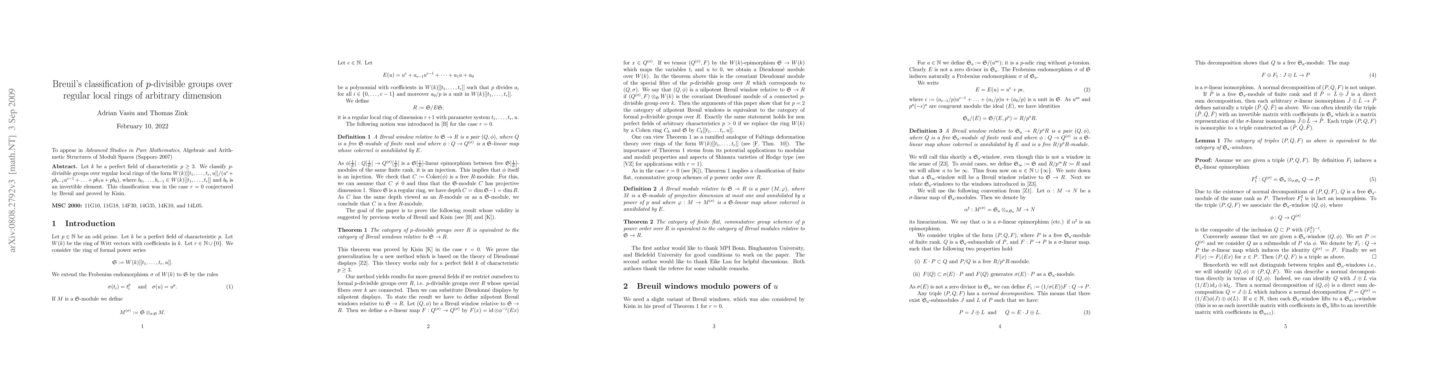 Let $k$ be a perfect field of characteristic $p \geq 3$. We classify $p$-divisible groups over regular local rings of the form $W(k)[[t_1,...,t_r,u]]/(u^e+pb_{e-1}u^{e-1}+...+pb_1u+pb_0)$, where $b_0,...,b_{e-1}\in W(k)[[t_1,...,t_r]]$ and $b_0$ is an invertible element. This classification was in the case $r = 0$ conjectured by Breuil and proved by Kisin.