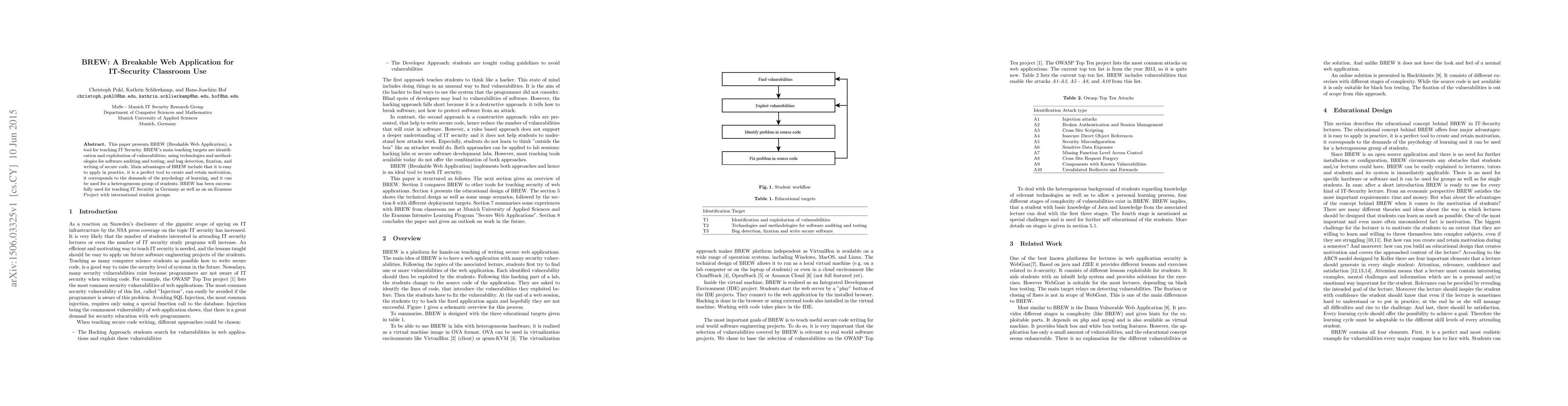 This paper presents BREW (Breakable Web Application), a tool for teaching IT Security. BREWs main teaching targets are identification and exploitation of vulnerabilities, using technologies and methodologies for software auditing and testing, and bug detection, fixation, and writing of secure code. Main advantages of BREW include that it is easy to apply in practice, it is a perfect tool to create and retain motivation, it corresponds to the demands of the psychology of learning, and it can be used for a heterogeneous group of students. BREW has been success- fully used for teaching IT Security in Germany as well as on an Erasmus Project with international student groups.
