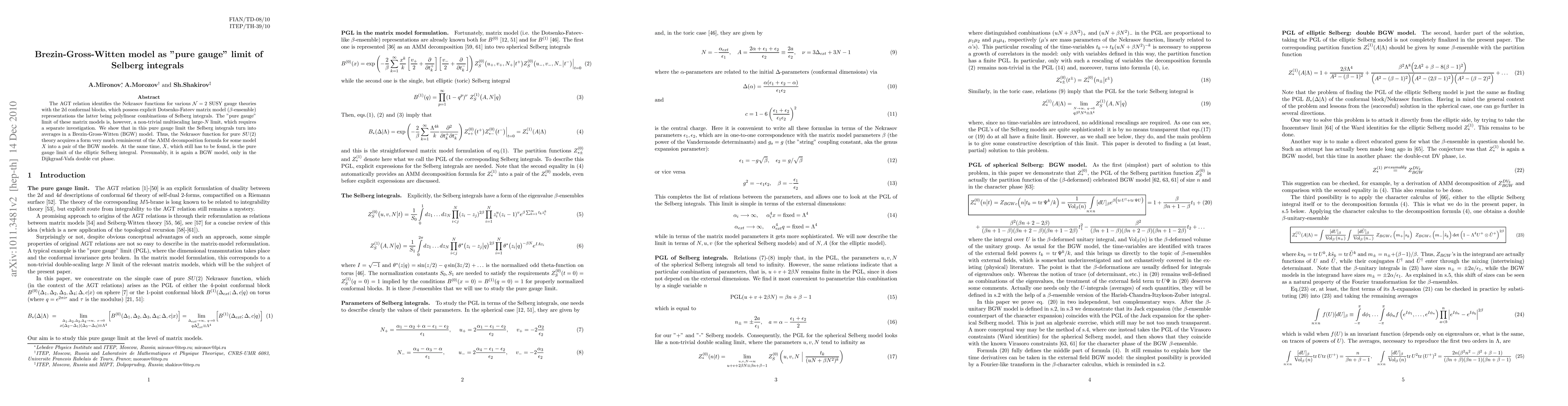 The AGT relation connects Nekrasov functions in N=2 SUSY gauge theories to 2d conformal blocks represented by Selberg integrals. In the "pure gauge" limit, these Selberg integrals transition into averages in a Brezin-Gross-Witten model, linking the Nekrasov function for pure SU(2) theory to a decomposition similar to the AMM formula.
