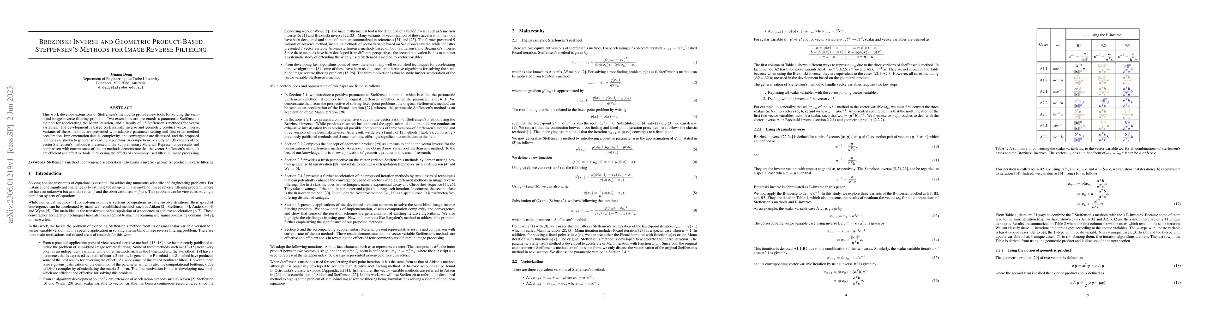 This work develops extensions of Steffensen's method to provide new tools for solving the semi-blind image reverse filtering problem. Two extensions are presented: a parametric Steffensen's method for accelerating the Mann iteration, and a family of 12 Steffensen's methods for vector variables. The development is based on Brezinski inverse and geometric product vector inverse. Variants of these methods are presented with adaptive parameter setting and first-order method acceleration. Implementation details, complexity, and convergence are discussed, and the proposed methods are shown to generalize existing algorithms. A comprehensive study of 108 variants of the vector Steffensen's methods is presented in the Supplementary Material. Representative results and comparison with current state-of-the-art methods demonstrate that the vector Steffensen's methods are efficient and effective tools in reversing the effects of commonly used filters in image processing.