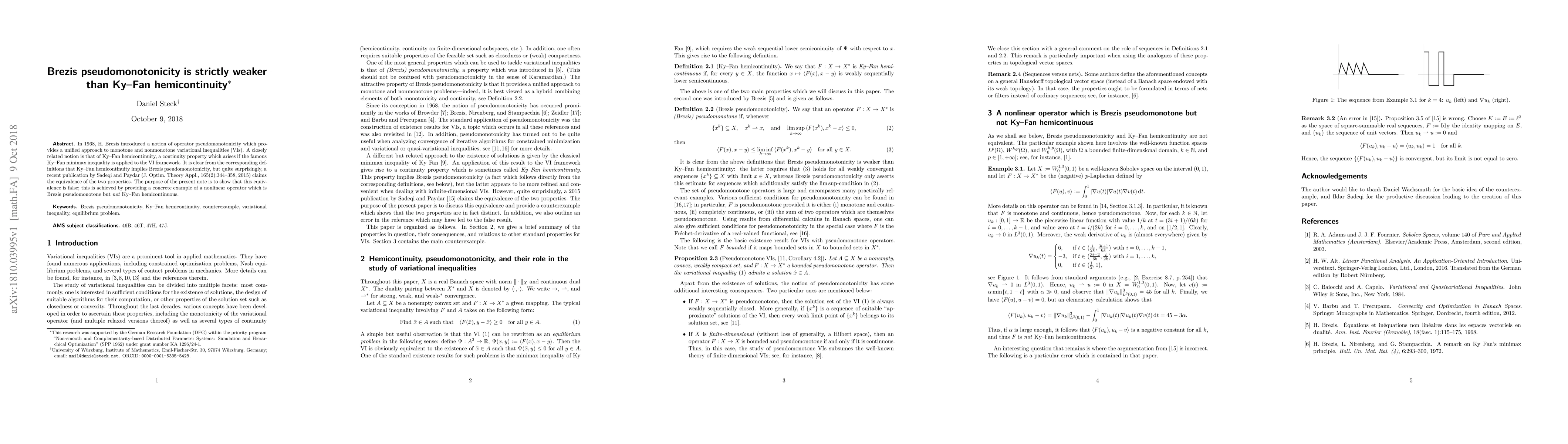 This paper demonstrates that Brezis pseudomonotonicity is strictly weaker than Ky-Fan hemicontinuity, refuting claims of their equivalence. It provides a specific nonlinear operator example that is Brezis pseudomonotone but not Ky-Fan hemicontinuous.