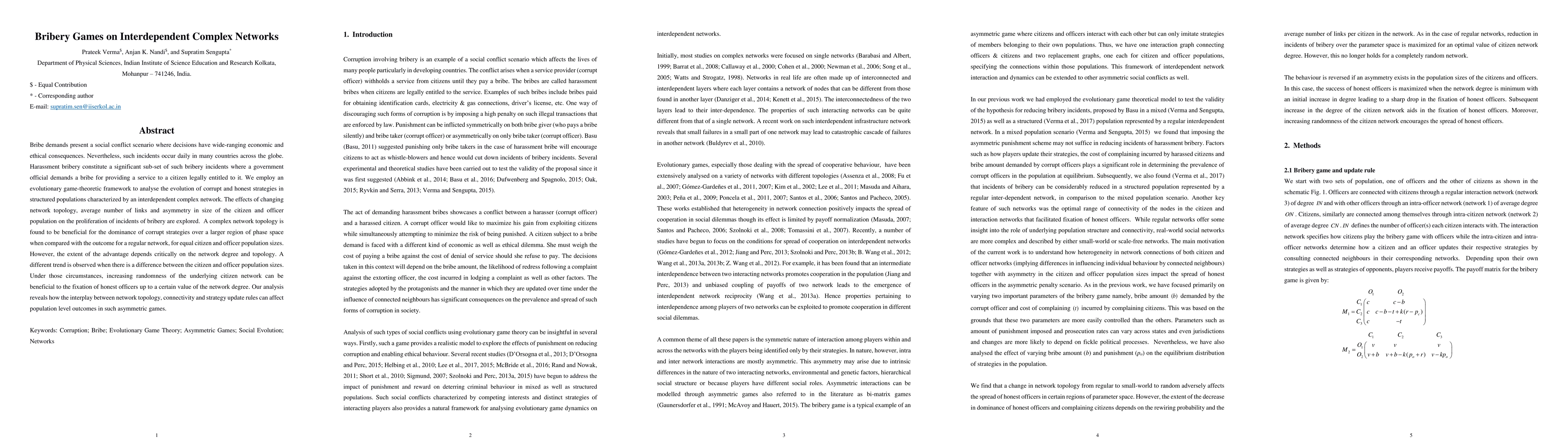 Bribe demands present a social conflict scenario where decisions have wide-ranging economic and ethical consequences. Nevertheless, such incidents occur daily in many countries across the globe. Harassment bribery constitute a significant sub-set of such bribery incidents where a government official demands a bribe for providing a service to a citizen legally entitled to it. We employ an evolutionary game-theoretic framework to analyse the evolution of corrupt and honest strategies in structured populations characterized by an interdependent complex network. The effects of changing network topology, average number of links and asymmetry in size of the citizen and officer population on the proliferation of incidents of bribery are explored. A complex network topology is found to be beneficial for the dominance of corrupt strategies over a larger region of phase space when compared with the outcome for a regular network, for equal citizen and officer population sizes. However, the extent of the advantage depends critically on the network degree and topology. A different trend is observed when there is a difference between the citizen and officer population sizes. Under those circumstances, increasing randomness of the underlying citizen network can be beneficial to the fixation of honest officers up to a certain value of the network degree. Our analysis reveals how the interplay between network topology, connectivity and strategy update rules can affect population level outcomes in such asymmetric games.