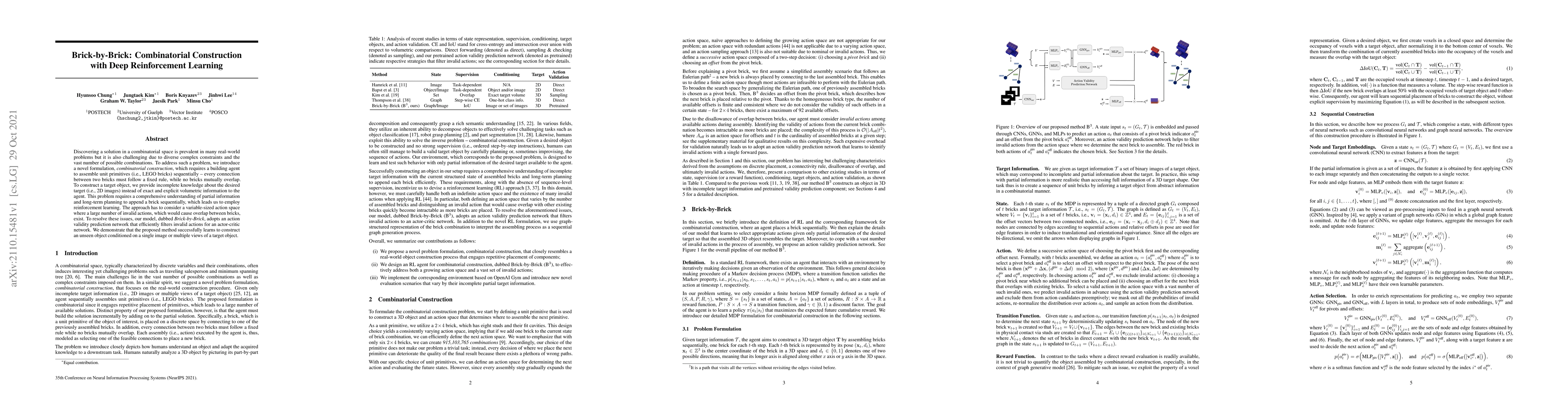 The paper introduces a reinforcement learning approach called Brick-by-Brick for solving combinatorial construction problems, where an agent sequentially assembles LEGO-like bricks following specific rules without overlap. The model uses an action validity prediction network to filter invalid actions and successfully learns to construct target objects from incomplete visual information.