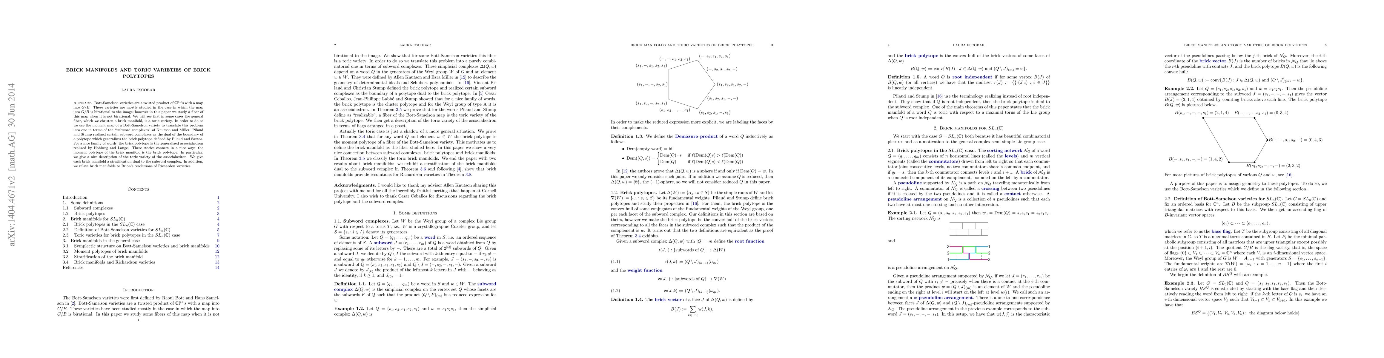 Bott-Samelson varieties are a twisted product of $\mathbb{C}\mathbb{P}^1$'s with a map into $G/B$. These varieties are mostly studied in the case in which the map into $G/B$ is birational to the image; however in this paper we study a fiber of this map when it is not birational. We will see that in some cases the general fiber, which we christen a brick manifold, is a toric variety. In order to do so we use the moment map of a Bott-Samelson variety to translate this problem into one in terms of the "subword complexes" of Knutson and Miller. Pilaud and Stump realized certain subword complexes as the dual of the boundary of a polytope which generalizes the brick polytope defined by Pilaud and Santos. For a nice family of words, the brick polytope is the generalized associahedron realized by Hohlweg and Lange. These stories connect in a nice way: the moment polytope of the brick manifold is the brick polytope. In particular, we give a nice description of the toric variety of the associahedron. We give each brick manifold a stratification dual to the subword complex. In addition, we relate brick manifolds to Brion's resolutions of Richardon varieties.