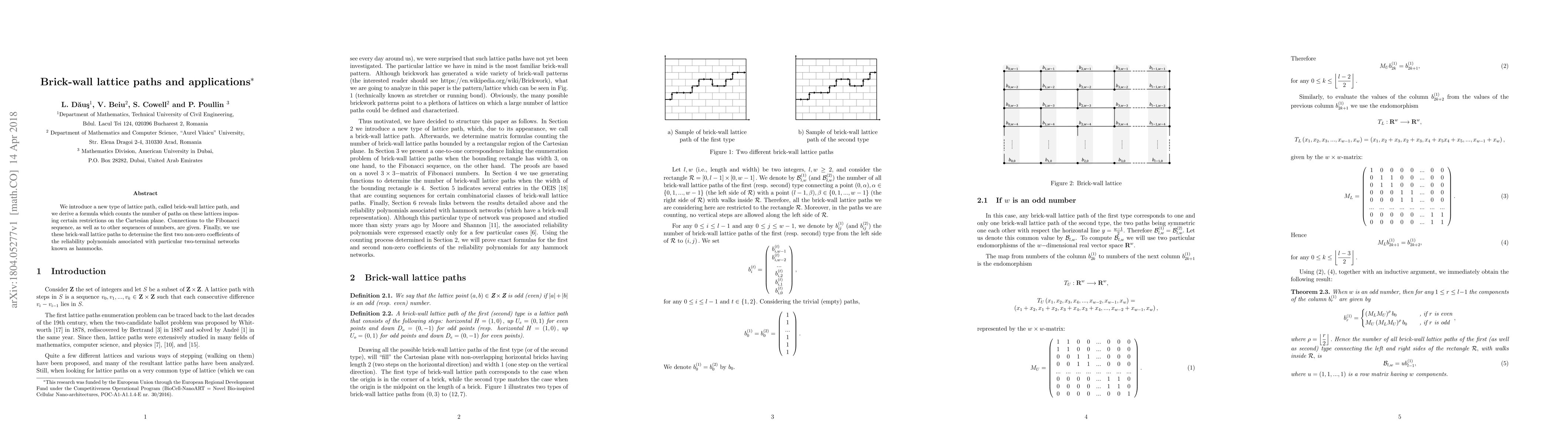 We introduce a new type of lattice path, called brick-wall lattice path, and we derive a formula which counts the number of paths on these lattices imposing certain restrictions on the Cartesian plane. Connections to the Fibonacci sequence, as well as to other sequences of numbers, are given. Finally, we use these brick-wall lattice paths to determine the first two non-zero coefficients of the reliability polynomials associated with particular two-terminal networks known as hammocks.