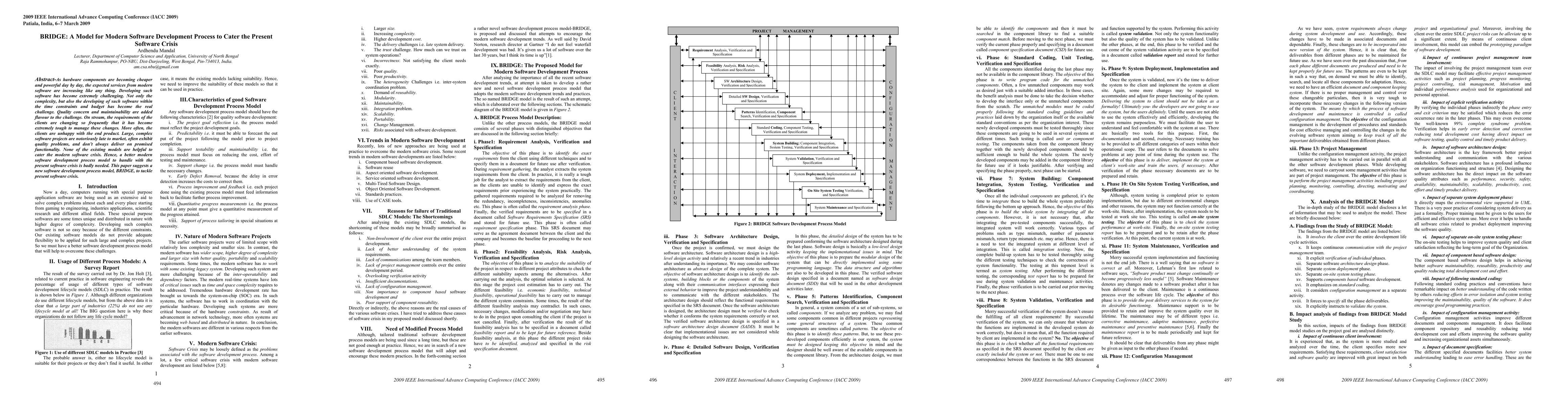 Title: BRIDGE: A Model for Modern Software Development Process to Cater the Present Software Crisis Summary: The paper introduces BRIDGE, a new software development process model aimed at addressing the modern software crisis, characterized by increasing complexity, time and budget constraints, and frequent client requirement changes, ultimately leading to client dissatisfaction and project failures.