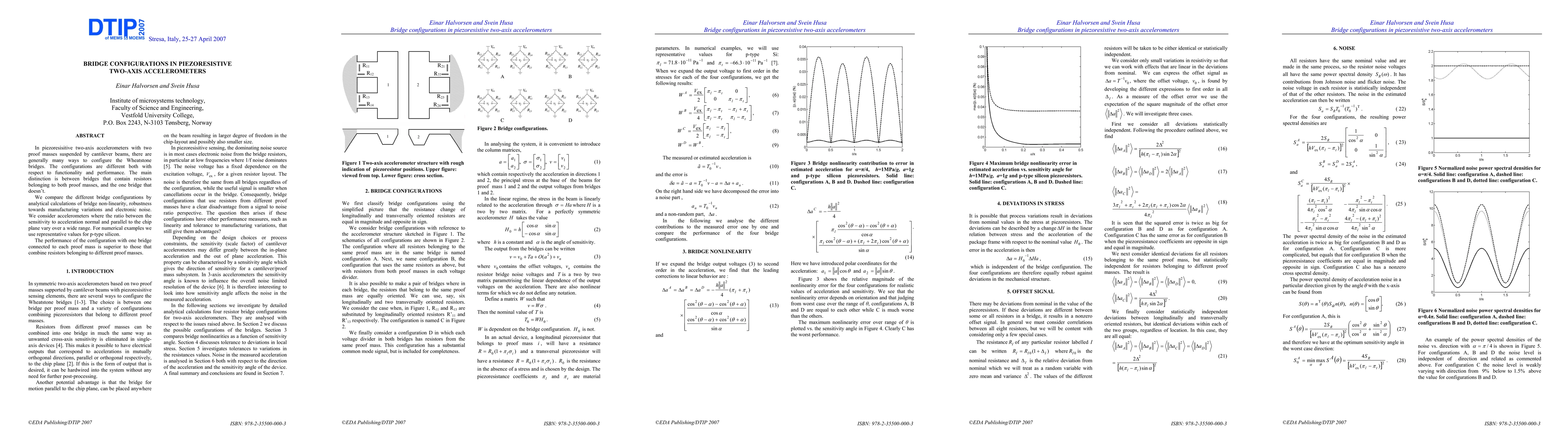 In piezoresisitive two-axis accelerometers with two proof masses suspended by cantilever beams, there are generally many ways to configure the Wheatstone bridges. The configurations are different both with respect to functionality and performance. The main distinction is between bridges that contain resistors belonging to both proof masses, and the one bridge that doesn't. We compare the different bridge configurations by analytical calculations of bridge non-linearity, robustness towards manufacturing variations and electronic noise. We consider accelerometers where the ratio between the sensitivity to acceleration normal and parallel to the chip plane vary over a wide range. For numerical examples we use representative values for p-type silicon. The performance of the configuration with one bridge connected to each proof mass is superior to those that combine resistors belonging to different proof masses.