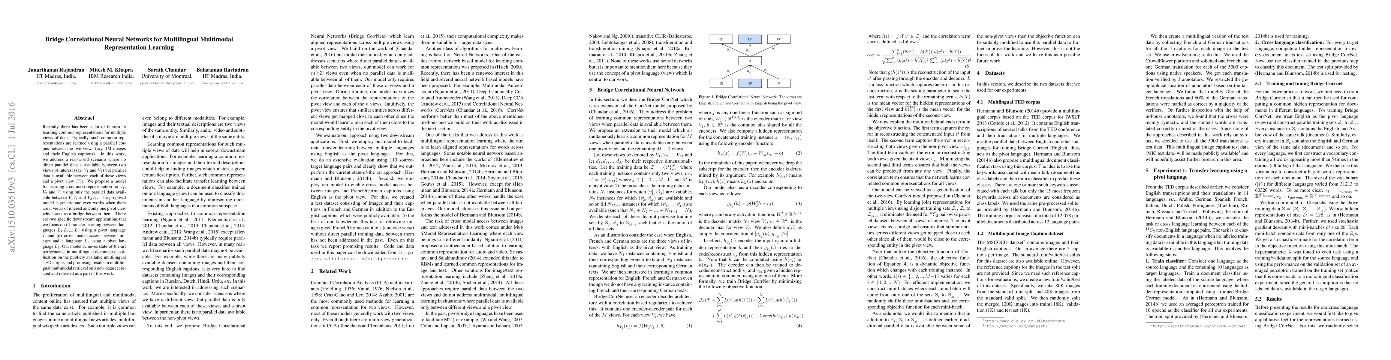 Recently there has been a lot of interest in learning common representations for multiple views of data. Typically, such common representations are learned using a parallel corpus between the two views (say, 1M images and their English captions). In this work, we address a real-world scenario where no direct parallel data is available between two views of interest (say, $V_1$ and $V_2$) but parallel data is available between each of these views and a pivot view ($V_3$). We propose a model for learning a common representation for $V_1$, $V_2$ and $V_3$ using only the parallel data available between $V_1V_3$ and $V_2V_3$. The proposed model is generic and even works when there are $n$ views of interest and only one pivot view which acts as a bridge between them. There are two specific downstream applications that we focus on (i) transfer learning between languages $L_1$,$L_2$,...,$L_n$ using a pivot language $L$ and (ii) cross modal access between images and a language $L_1$ using a pivot language $L_2$. Our model achieves state-of-the-art performance in multilingual document classification on the publicly available multilingual TED corpus and promising results in multilingual multimodal retrieval on a new dataset created and released as a part of this work.