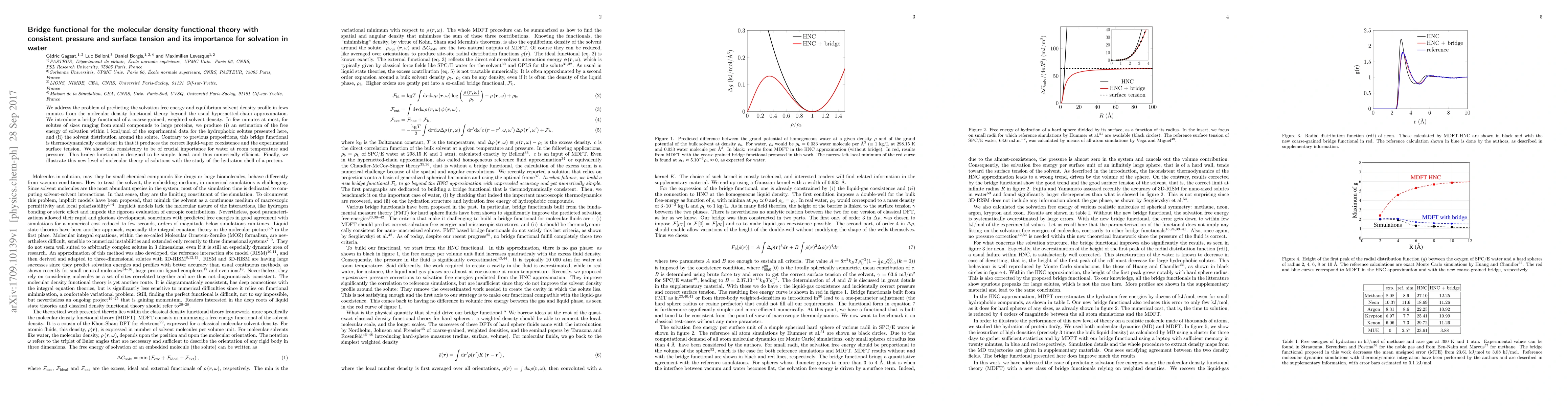 This paper introduces a new bridge functional for molecular density functional theory that accurately predicts solvation free energy and solvent density profiles within minutes, achieving results within 1 kcal/mol of experimental data for hydrophobic solutes. This functional is thermodynamically consistent, crucial for accurately modeling water's surface tension and liquid-vapor coexistence, and is demonstrated through the study of a protein's hydration shell.
