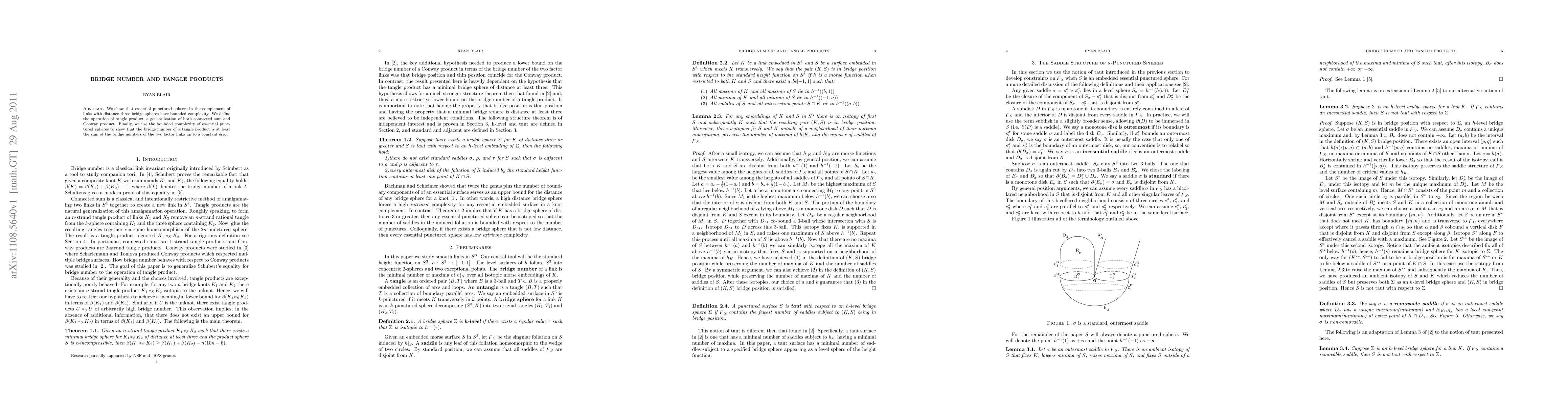 This paper demonstrates that essential punctured spheres in links with distance three bridge spheres have limited complexity. It introduces a tangle product operation, which generalizes connected sum and Conway product, and uses this to prove that the bridge number of a tangle product is at least the sum of the bridge numbers of its component links, allowing for a small constant error.