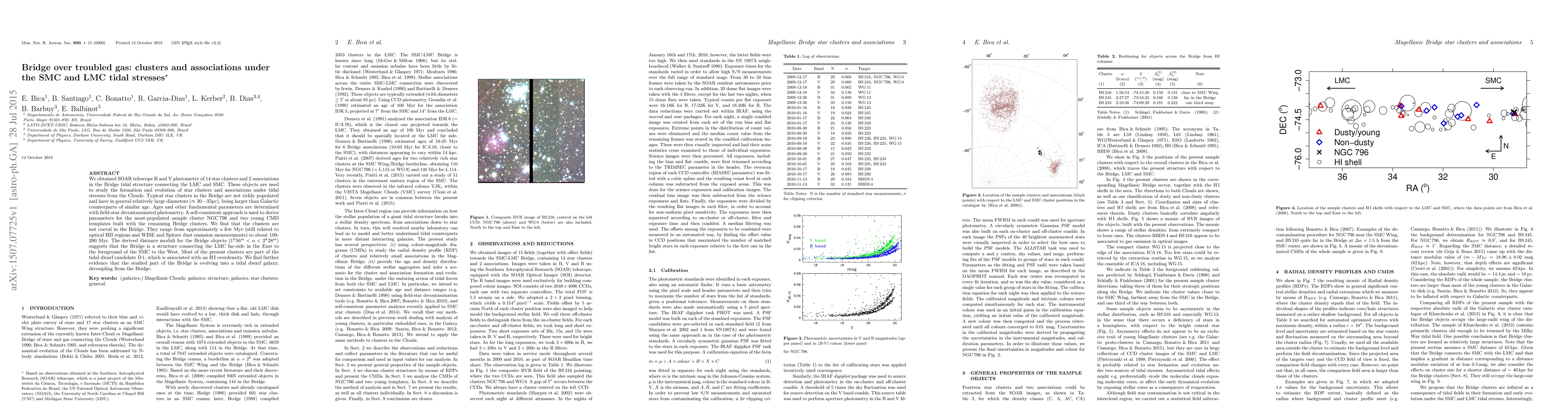This study uses SOAR telescope photometry to analyze 14 star clusters and 2 associations in the Bridge tidal structure between the LMC and SMC, revealing clusters with larger diameters and varying ages from a few Myr to 200 Myr. The findings suggest the Bridge is evolving into a tidal dwarf galaxy.