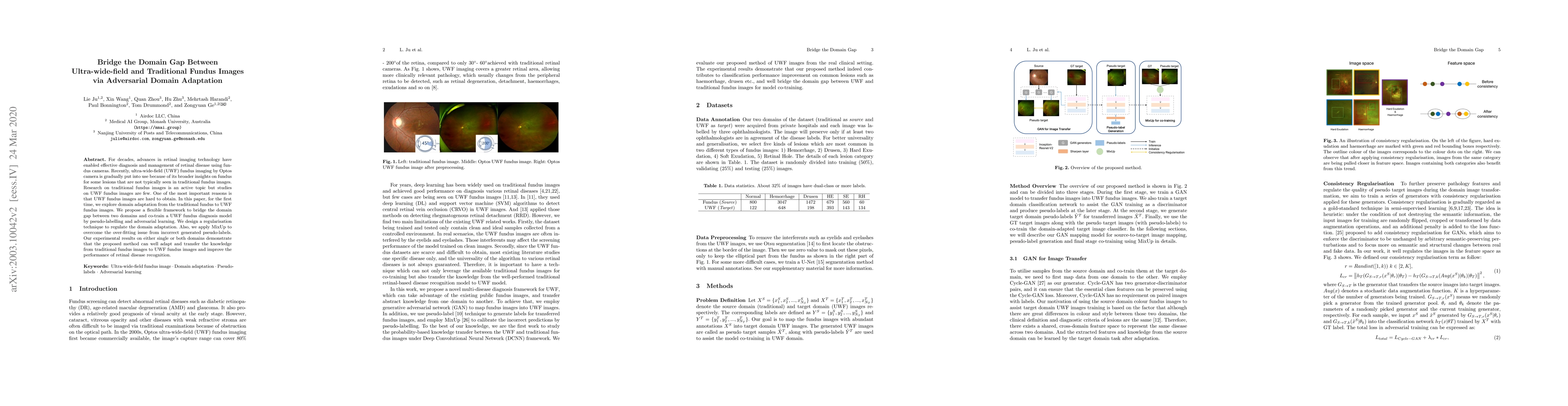 This paper proposes a framework for domain adaptation to bridge the gap between traditional and ultra-wide-field fundus images, using adversarial learning and pseudo-labelling to enhance UWF fundus diagnosis. The method employs MixUp and a regularization technique to improve model performance and overcome overfitting.