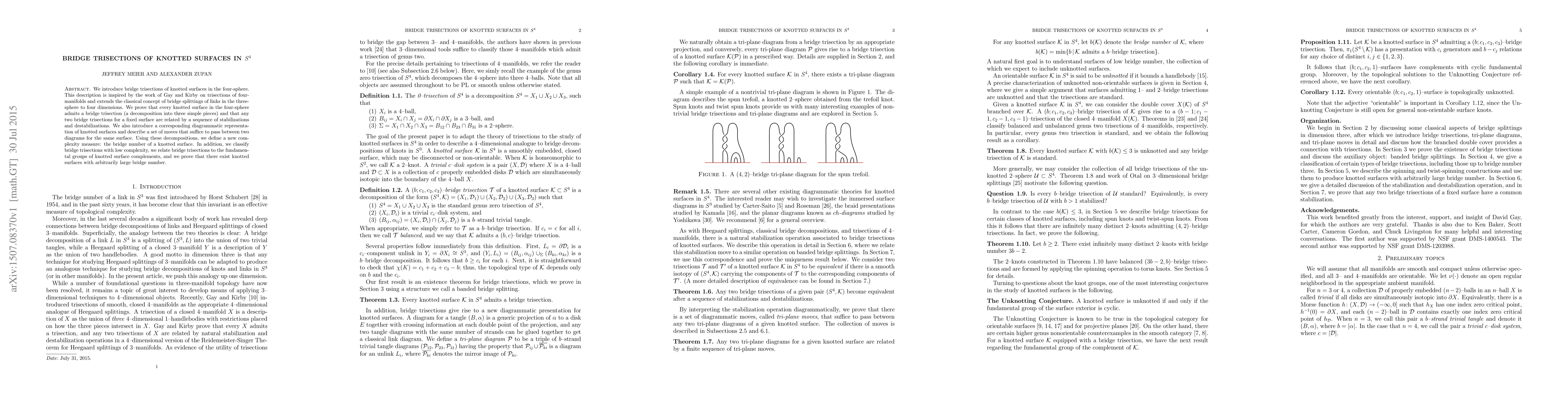 The paper introduces bridge trisections of knotted surfaces in $S^4$, extending classical concepts from $S^3$ to higher dimensions. It proves the existence and equivalence of bridge trisections and defines a new complexity measure, the bridge number, while classifying low complexity trisections and establishing connections to fundamental groups.
