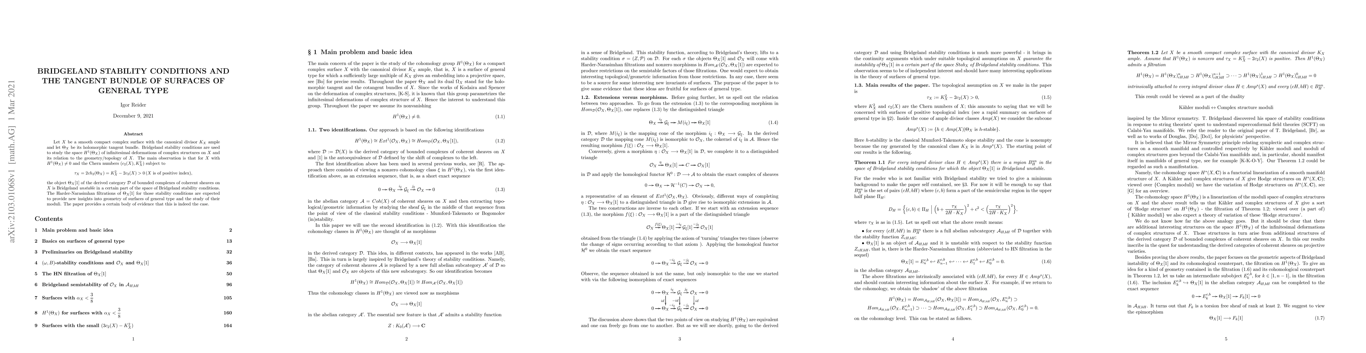 Let $X$ be a smooth compact complex surface with the canonical divisor $K_X$ ample and let $\Theta_X$ be its holomorphic tangent bundle. Bridgeland stability conditions are used to study the space $H^1 (\Theta_X)$ of infinitesimal deformations of complex structures of $X$ and its relation to the geometry/topology of $X$. The main observation is that for $X$ with $H^1 (\Theta_X)$ nonzero and the Chern numbers $(c_2 (X), K^2_X)$ subject to $$ \tau_X :=2ch_2 (\Theta_X)=K^2_X -2c_2(X) >0 $$ the object $\Theta_X [1]$ of the derived category of bounded complexes of coherent sheaves on $X$ is Bridgeland unstable in a certain part of the space of Bridgeland stability conditions. The Harder-Narasimhan filtrations of $\Theta_X [1]$ for those stability conditions are expected to provide new insights into geometry of surfaces of general type and the study of their moduli. The paper provides a certain body of evidence that this is indeed the case.