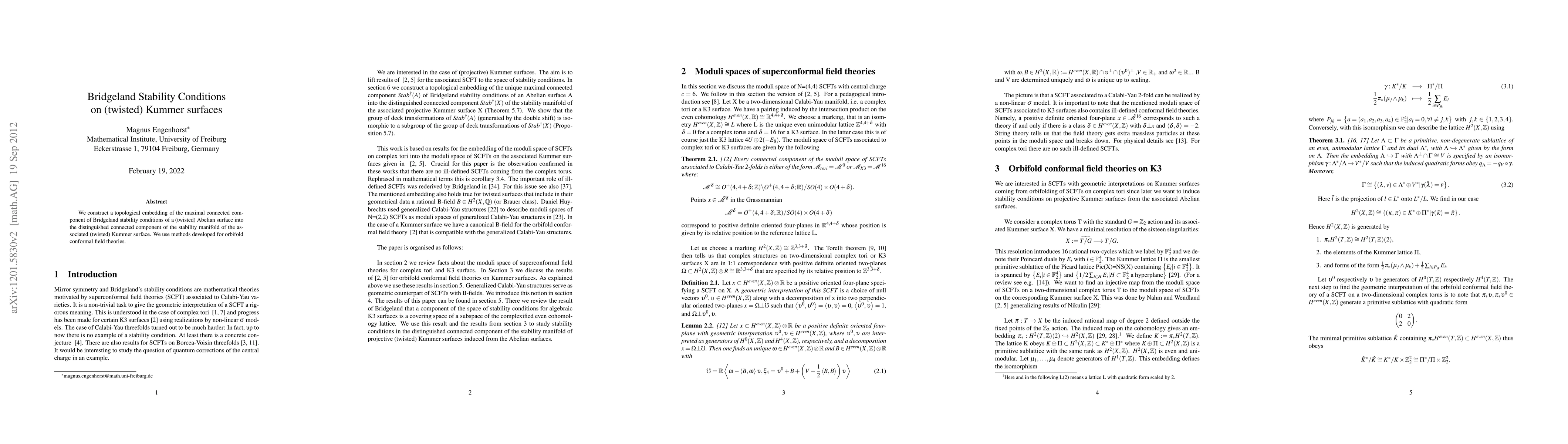 Summary: This paper constructs a topological embedding of the maximal connected component of Bridgeland stability conditions for a twisted Abelian surface into the stability manifold of its associated twisted Kummer surface, utilizing methods from orbifold conformal field theories.