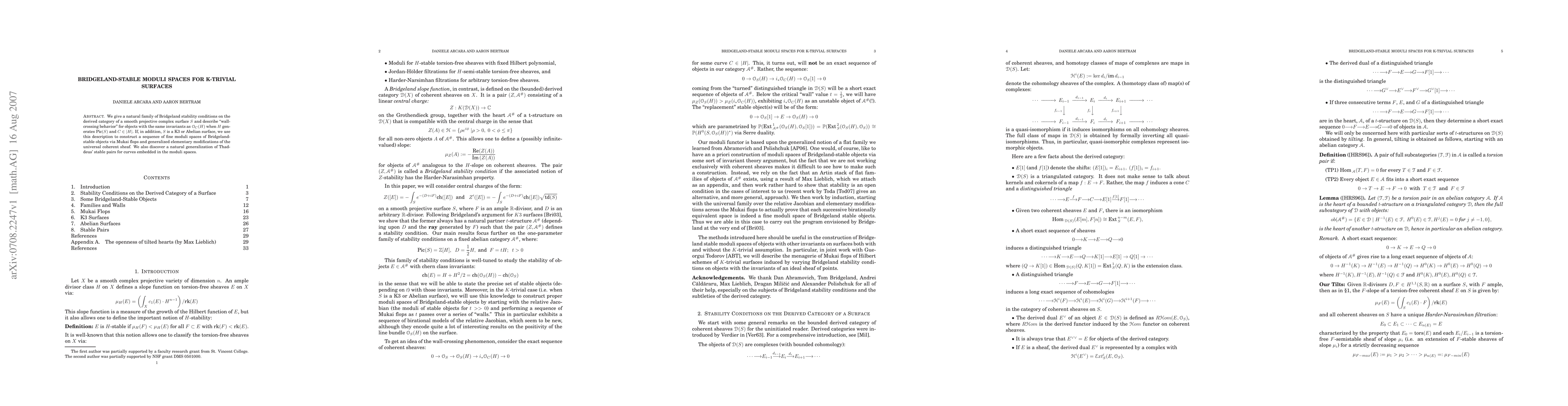 This paper introduces a family of Bridgeland stability conditions on the derived category of K-trivial smooth projective surfaces, analyzing wall-crossing behavior for specific objects. For K3 or Abelian surfaces, it constructs moduli spaces of Bridgeland-stable objects using Mukai flops and explores a generalized stable pairs concept.