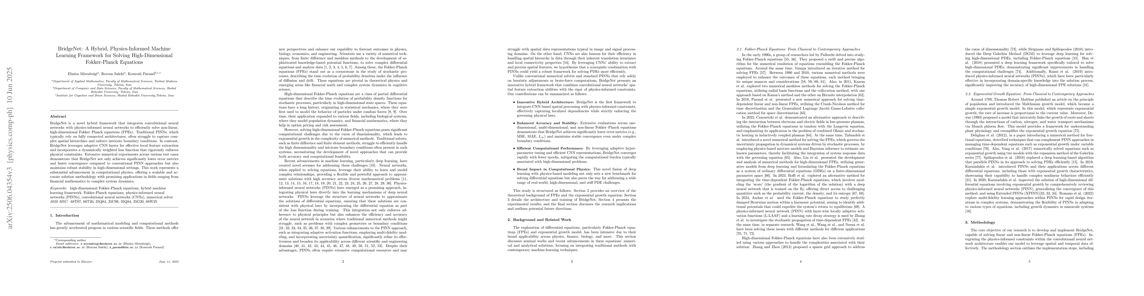BridgeNet efficiently solves high-dimensional Fokker-Planck equations using a hybrid framework combining convolutional neural networks and physics-informed neural networks with improved local feature extraction and physical constraint enforcement.