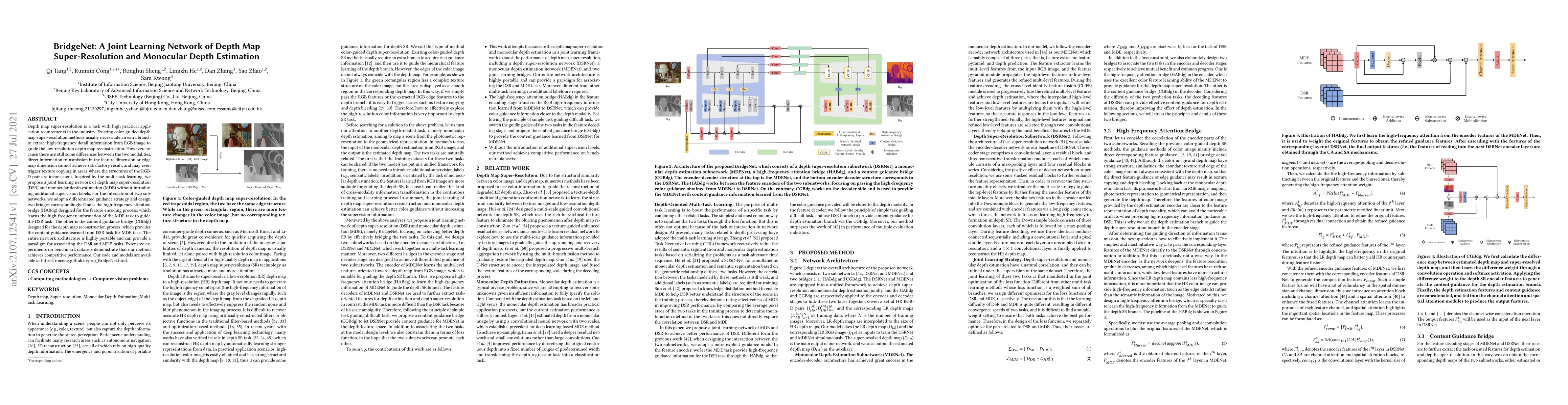 BridgeNet proposes a joint learning network for depth map super-resolution and monocular depth estimation, leveraging a differentiated guidance strategy without additional supervision. The network achieves competitive performance through high-frequency attention and content guidance bridges, demonstrating a new paradigm for associating these tasks.