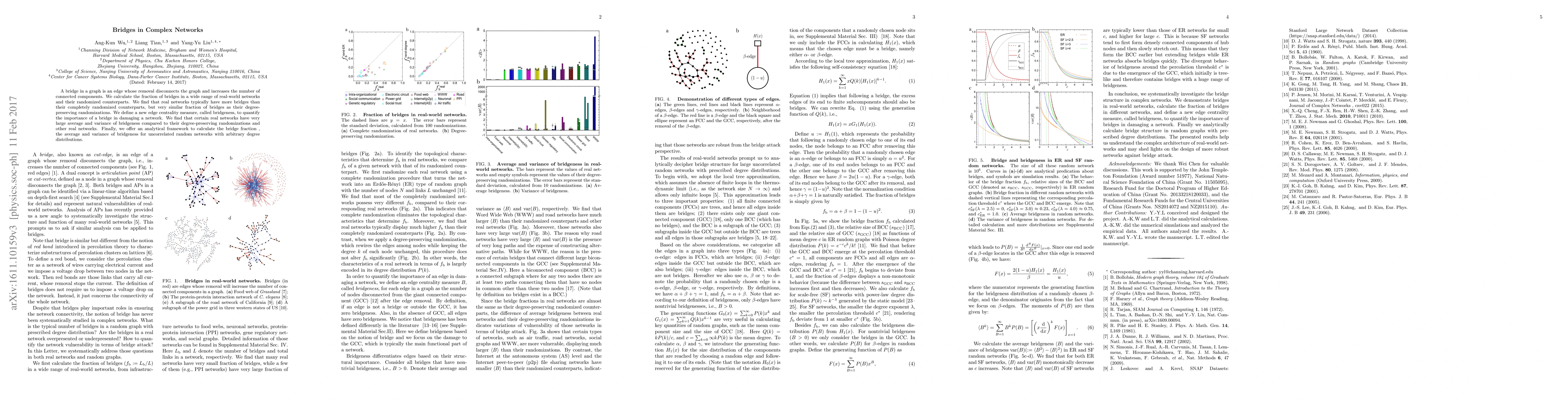 A bridge in a graph is an edge whose removal disconnects the graph and increases the number of connected components. We calculate the fraction of bridges in a wide range of real-world networks and their randomized counterparts. We find that real networks typically have more bridges than their completely randomized counterparts, but very similar fraction of bridges as their degree-preserving randomizations. We define a new edge centrality measure, called bridgeness, to quantify the importance of a bridge in damaging a network. We find that certain real networks have very large average and variance of bridgeness compared to their degree-preserving randomizations and other real networks. Finally, we offer an analytical framework to calculate the bridge fraction , the average and variance of bridgeness for uncorrelated random networks with arbitrary degree distributions.