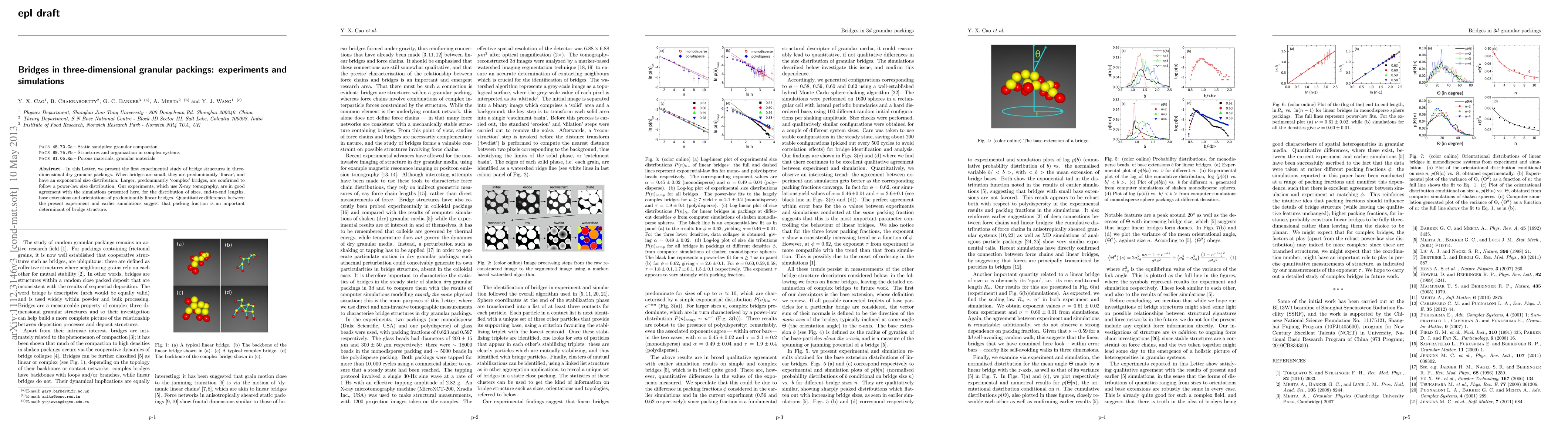 This paper investigates bridge structures in three-dimensional granular packings through experiments using X-ray tomography and simulations, finding that small bridges follow an exponential size distribution while larger ones follow a power-law distribution. The study highlights the importance of packing fraction in determining bridge structure and shows good agreement between experimental and simulated bridge characteristics.