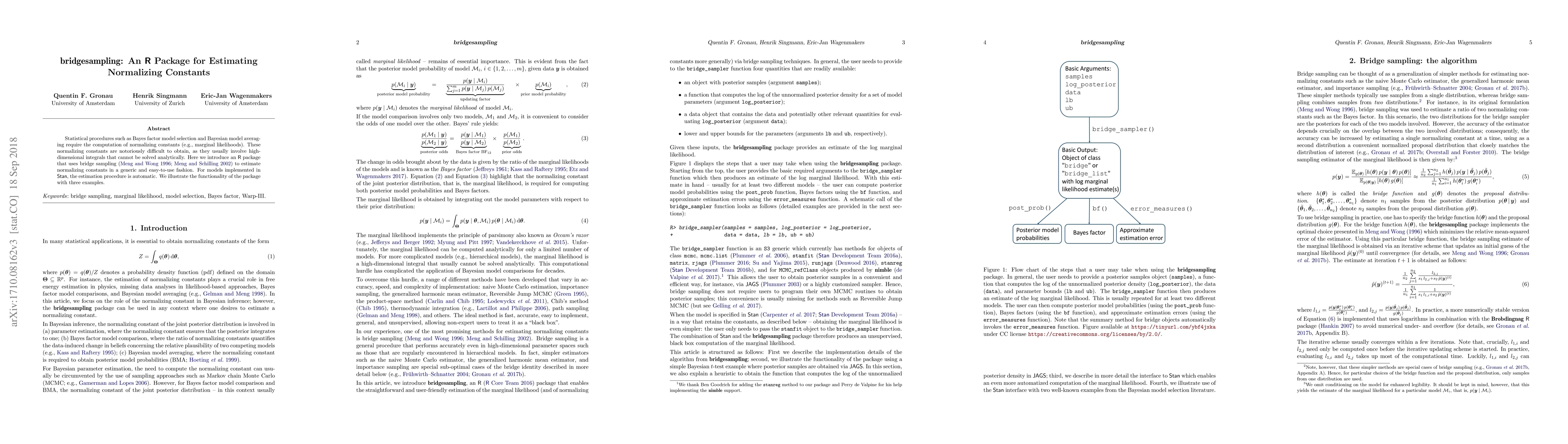 The "bridgesampling" R package facilitates the estimation of normalizing constants, essential for Bayes factor model selection and Bayesian model averaging, using bridge sampling techniques. It automates the process for models implemented in Stan and demonstrates its utility through three examples.