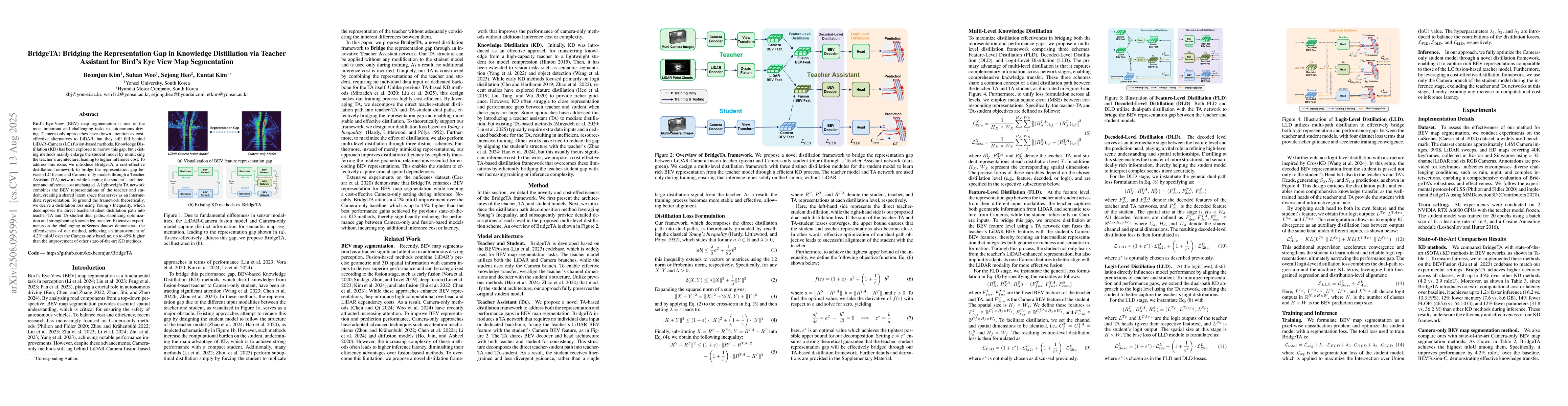 Bird's-Eye-View (BEV) map segmentation is one of the most important and challenging tasks in autonomous driving. Camera-only approaches have drawn attention as cost-effective alternatives to LiDAR, but they still fall behind LiDAR-Camera (LC) fusion-based methods. Knowledge Distillation (KD) has been explored to narrow this gap, but existing methods mainly enlarge the student model by mimicking the teacher's architecture, leading to higher inference cost. To address this issue, we introduce BridgeTA, a cost-effective distillation framework to bridge the representation gap between LC fusion and Camera-only models through a Teacher Assistant (TA) network while keeping the student's architecture and inference cost unchanged. A lightweight TA network combines the BEV representations of the teacher and student, creating a shared latent space that serves as an intermediate representation. To ground the framework theoretically, we derive a distillation loss using Young's Inequality, which decomposes the direct teacher-student distillation path into teacher-TA and TA-student dual paths, stabilizing optimization and strengthening knowledge transfer. Extensive experiments on the challenging nuScenes dataset demonstrate the effectiveness of our method, achieving an improvement of 4.2% mIoU over the Camera-only baseline, up to 45% higher than the improvement of other state-of-the-art KD methods.