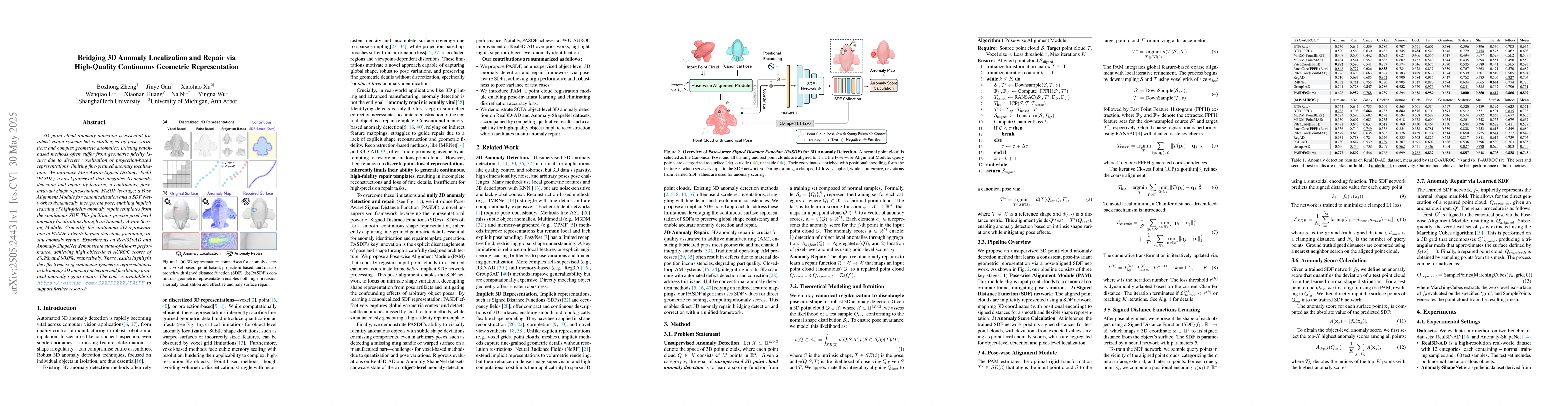 The research introduces Pose-Aware Signed Distance Field (PASDF), a framework that integrates 3D anomaly detection and repair by learning a continuous, pose-invariant shape representation. PASDF uses a Pose Alignment Module for canonicalization and a SDF Network to dynamically incorporate pose, enabling high-fidelity anomaly repair templates from the continuous SDF. This facilitates precise pixel-level anomaly localization.