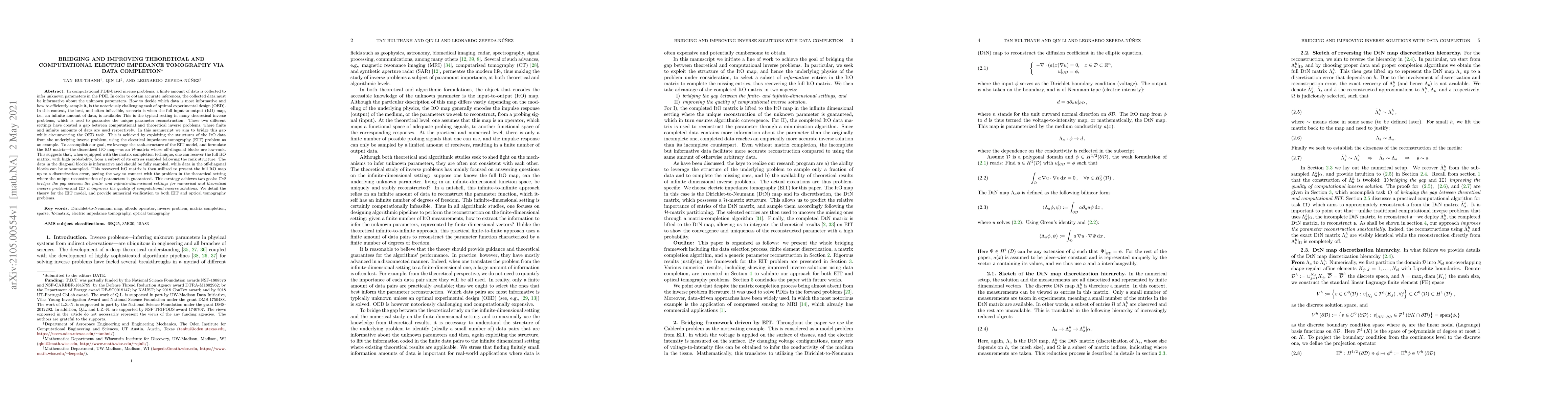 In computational PDE-based inverse problems, a finite amount of data is collected to infer unknown parameters in the PDE. In order to obtain accurate inferences, the collected data must be informative about the unknown parameters. How to decide which data is most informative and how to efficiently sample it, is the notoriously challenging task of optimal experimental design (OED). In this context, the best, and often infeasible, scenario is when the full input-to-output (ItO) map, i.e., an infinite amount of data, is available: This is the typical setting in many theoretical inverse problems, which is used to guarantee the unique parameter reconstruction. These two different settings have created a gap between computational and theoretical inverse problems. In this manuscript we aim to bridge this gap while circumventing the OED task. This is achieved by exploiting the structures of the ItO data from the underlying inverse problem, using the electrical impedance tomography (EIT) problem as an example. We leverage the rank-structure of the EIT model, and formulate the discretized ItO map, as an H-matrix. This suggests that one can recover the full ItO matrix, with high probability, from a subset of its entries sampled following the rank structure: The data in the diagonal blocks is informative thus fully sampled, while data in the off-diagonal blocks can be sub-sampled. This recovered ItO matrix is then utilized to represent the full ItO map, allowing us to connect with the problem in the theoretical setting where the unique reconstruction is guaranteed. This strategy achieves two goals: I) it bridges the gap between the settings for the numerical and theoretical inverse problems and II) it improves the quality of computational inverse solutions. We detail the theory for the EIT model, and provide numerical verification to both EIT and optical tomography problems