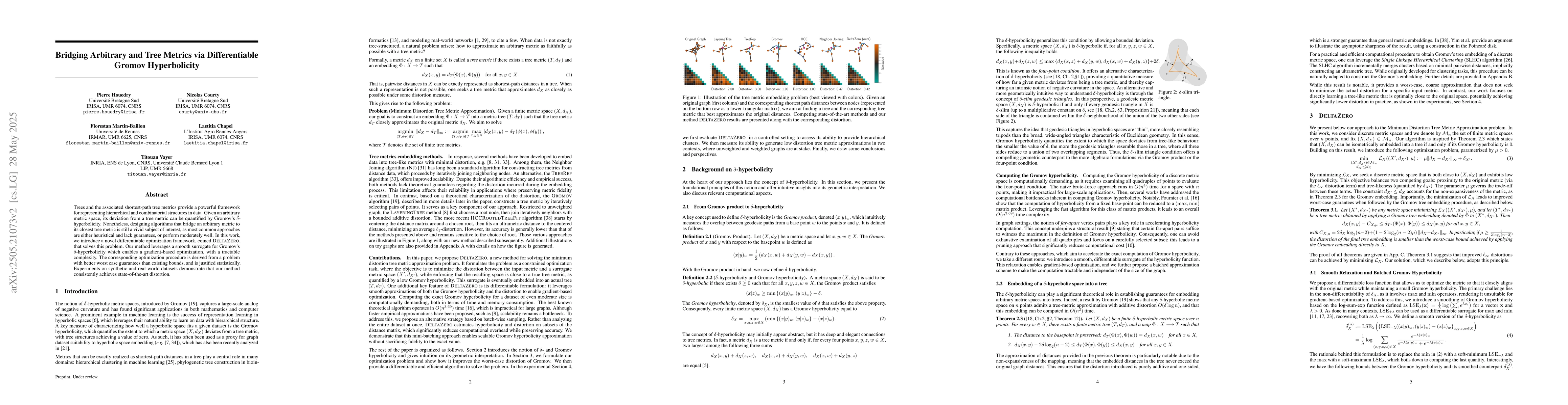 The research introduces DeltaZero, a differentiable optimization framework that bridges an arbitrary metric to its closest tree metric by leveraging a smooth surrogate for Gromov's $\delta$-hyperbolicity, enabling gradient-based optimization with tractable complexity.