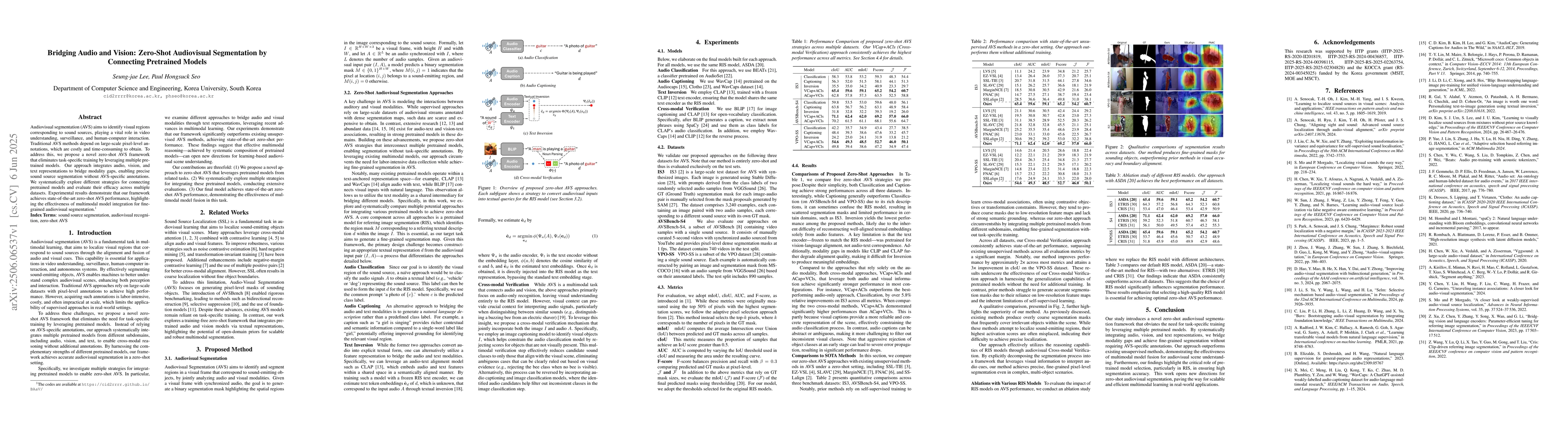 This paper proposes a novel zero-shot audiovisual segmentation framework that leverages pretrained models to segment visual regions corresponding to sound sources without requiring costly pixel-level annotations. It achieves state-of-the-art performance across multiple datasets using multimodal model integration.